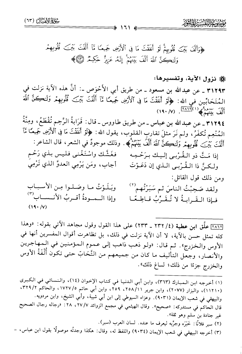 ٣١٢٩٤ - عن عبد الله بن عباس -من طريق طاووس- قال: قَرابةُ الرَّحِم تُقْطَعُ، ومِنَّةُ المُنْعِم تُكفَرُ، ولم نَرَ مثلَ تقاربِ القلوب، يقول الله: {لو أنفقت ما في الأرض جميعا ما ألفت بين قلوبهم ولكن الله ألف بينهم}. وذلك موجودٌ في الشعر، قال الشاعر: