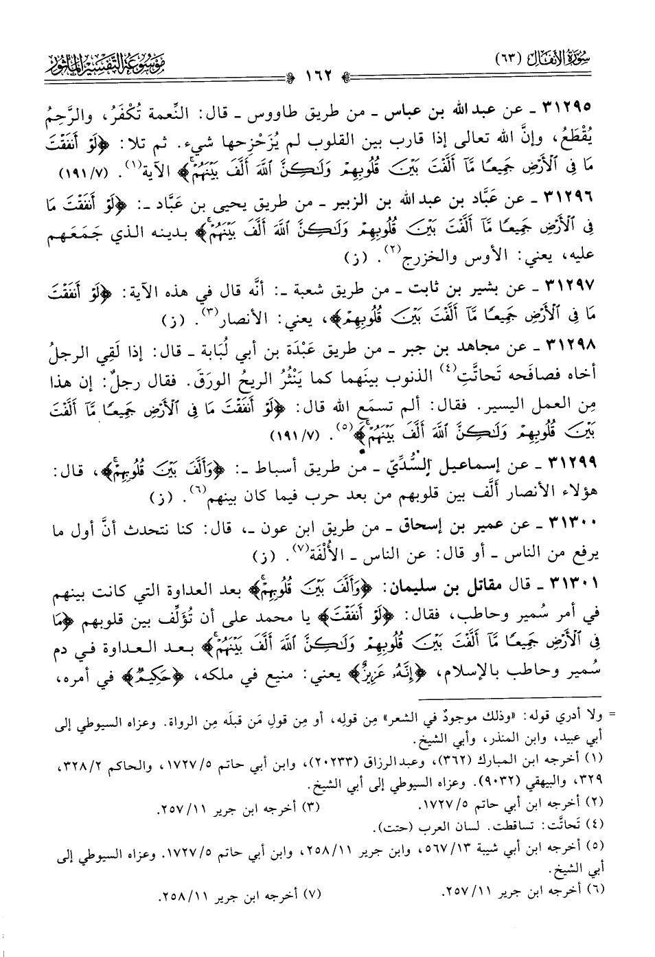 ٣١٢٩٦ - عن عَبّاد بن عبد الله بن الزبير -من طريق يحيى بن عَبّاد-: {لو أنفقت ما في الأرض جميعا ما ألفت بين قلوبهم ولكن الله ألف بينهم} بدينه الذي جَمَعَهم عليه، يعني: الأوس والخزرج (¬٢). (ز)