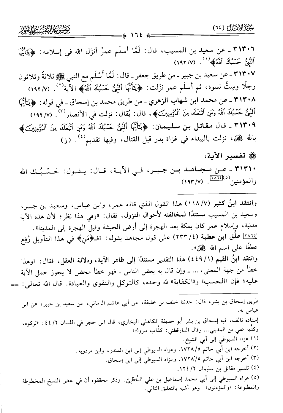 ٣١٣٠٨ - عن محمد ابن شهاب الزهري -من طريق محمد بن إسحاق- في قوله: {يا أيها النبي حسبك الله ومن اتبعك من المؤمنين}، قال: يُقال: نزلت في الأنصار (¬٣). (٧/ ١٩٢)
