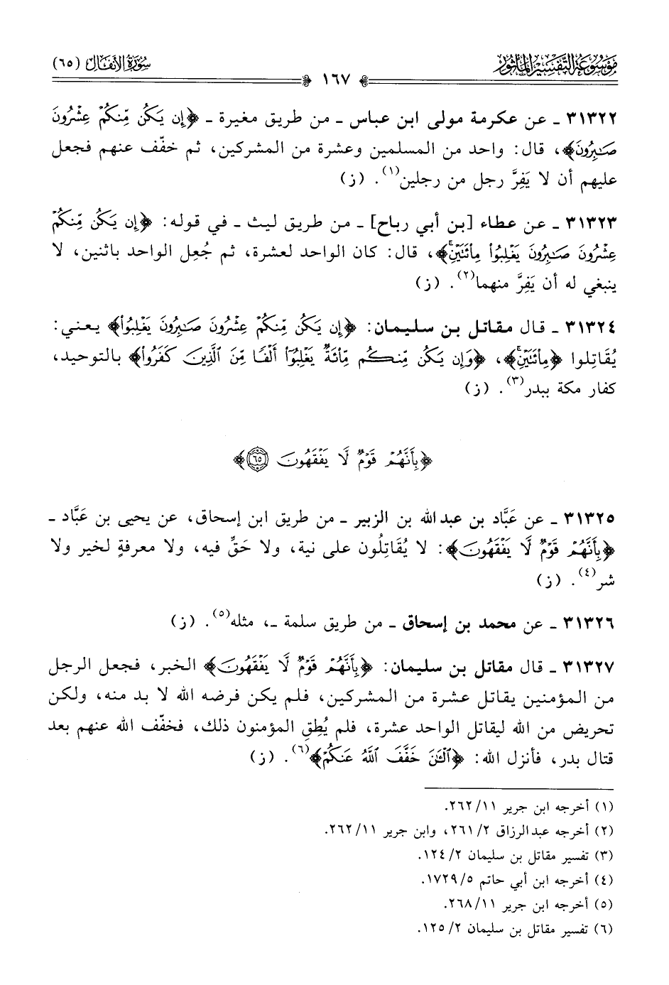 ٣١٣٢٢ - عن عكرمة مولى ابن عباس -من طريق مغيرة- {إنْ يَكُنْ مِنكُمْ عِشْرُونَ صابِرُونَ}، قال: واحد من المسلمين وعشرة من المشركين، ثم خفّف عنهم فجعل عليهم أن لا يَفِرَّ رجل من رجلين (¬١). (ز)