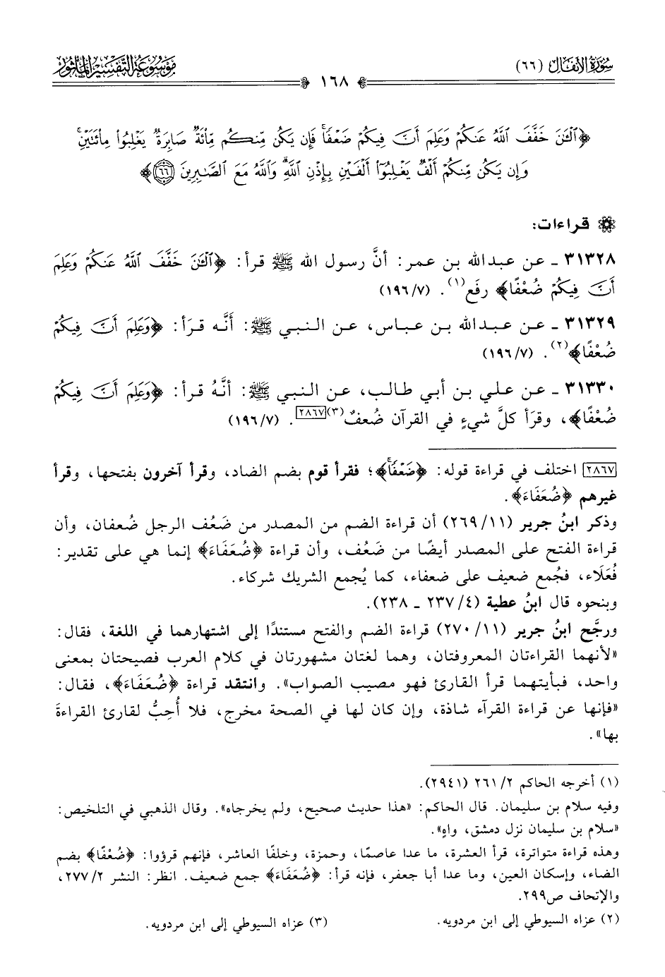 ٣١٣٣٠ - عن علي بن أبي طالب، عن النبي - صلى الله عليه وسلم - أنّهُ قرأ: «وعَلِمَ أنَّ فِيكُمْ ضُعْفًا»، وقرَأ كلَّ شيءٍ في القرآن ضُعفٌ (¬٣) [٢٨٦٧]. (٧/ ١٩٦)
