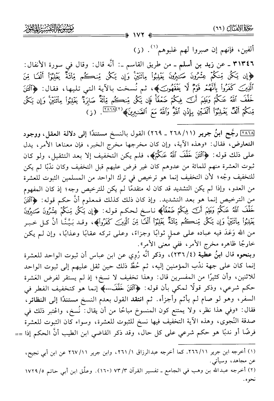 ٣١٣٤٦ - عن زيد بن أسلم -من طريق القاسم- أنّه قال: وقال في سورة الأنفال: {إنْ يَكُنْ مِنكُمْ عِشْرُونَ صابِرُونَ يَغْلِبُوا مِائَتَيْنِ وإنْ يَكُنْ مِنكُمْ مِائَةٌ يَغْلِبُوا ألْفًا مِنَ الَّذِينَ كَفَرُوا بِأَنَّهُمْ قَوْمٌ لا يَفْقَهُونَ}، ثم نُسخت بالآية التي تليها، فقال: {الآنَ خَفَّفَ اللَّهُ عَنْكُمْ وعَلِمَ أنَّ فِيكُمْ ضَعْفًا فَإنْ يَكُنْ مِنكُمْ مِائَةٌ صابِرَةٌ يَغْلِبُوا مِائَتَيْنِ وإنْ يَكُنْ مِنكُمْ ألْفٌ يَغْلِبُوا ألْفَيْنِ بِإذْنِ اللَّهِ واللَّهُ مَعَ الصّابِرِينَ} (¬٢) [٢٨٦٨]. (ز)
