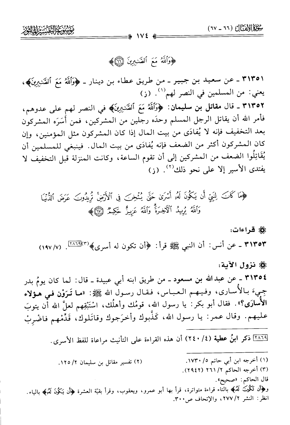 ٣١٣٥٣ - عن أنس، أن النبي - صلى الله عليه وسلم - قرأ: «أن تَكُونَ لَهُ أسْرى» (¬٣) [٢٨٦٩]. (٧/ ١٩٧)