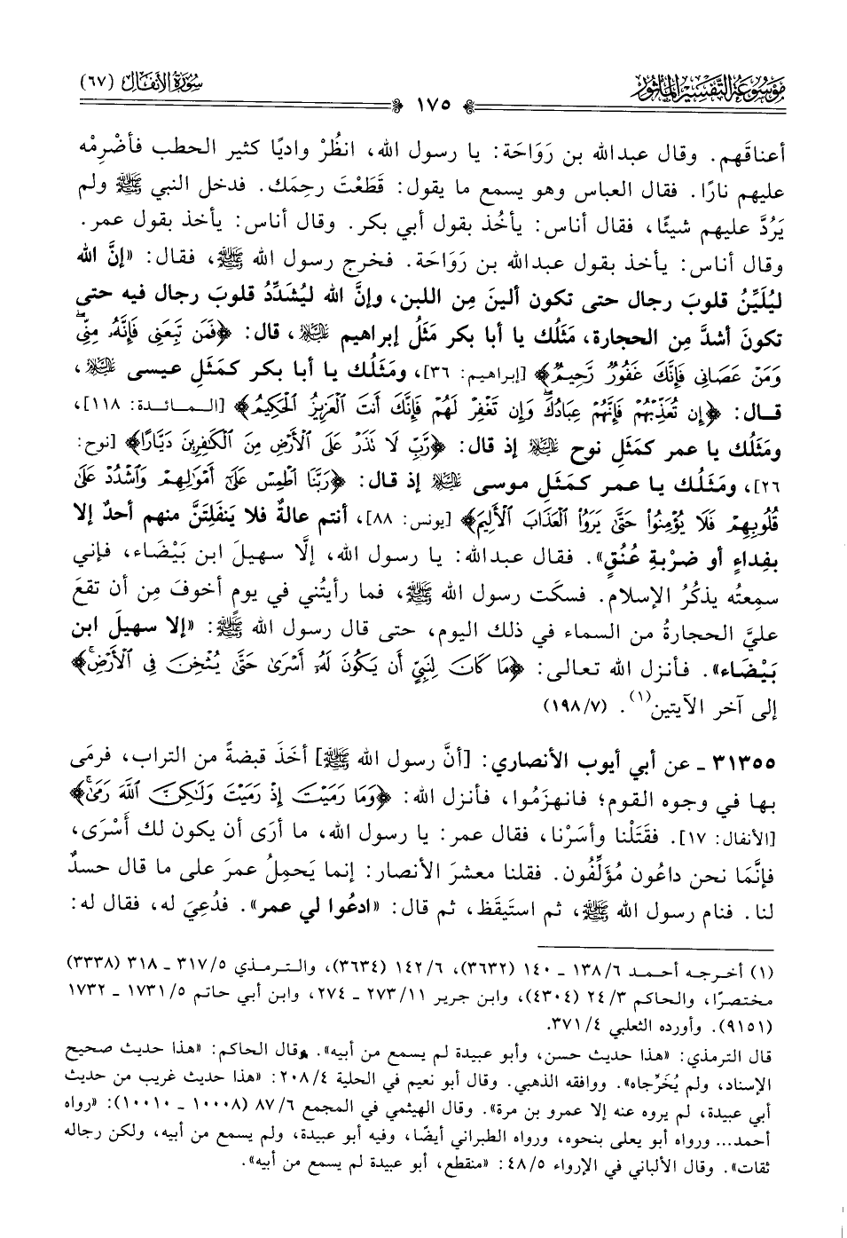 ٣١٣٥٥ - عن أبي أيوب الأنصاري: [أنّ رسول الله - صلى الله عليه وسلم -] أخَذَ قبضةً من التراب، فرمى بها في وجوه القوم؛ فانهزَمُوا، فأنزل الله: {وما رميت إذ رميت ولكن الله رمى}. فقَتَلْنا وأسَرْنا، فقال عمر: يا رسول الله، ما أرى أن يكون لك أسْرى، فإنّما نحن داعُون مُؤَلِّفُون. فقلنا معشرَ الأنصار: إنما يَحمِلُ عمرَ على ما قال حسدٌ لنا. فنام رسول الله - صلى الله عليه وسلم -، ثم استَيقَظ، ثم قال: «ادعُوا لي عمر». فدُعِيَ له، فقال له: