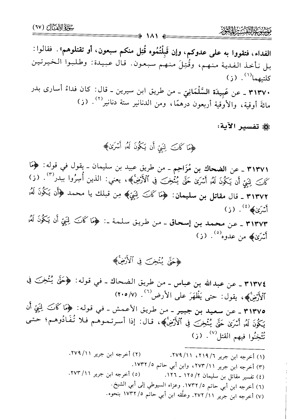 ٣١٣٧٣ - عن محمد بن إسحاق -من طريق سلمة-: {ما كان لنبي أن يكون له أسرى} من عدوه (¬٥). (ز)