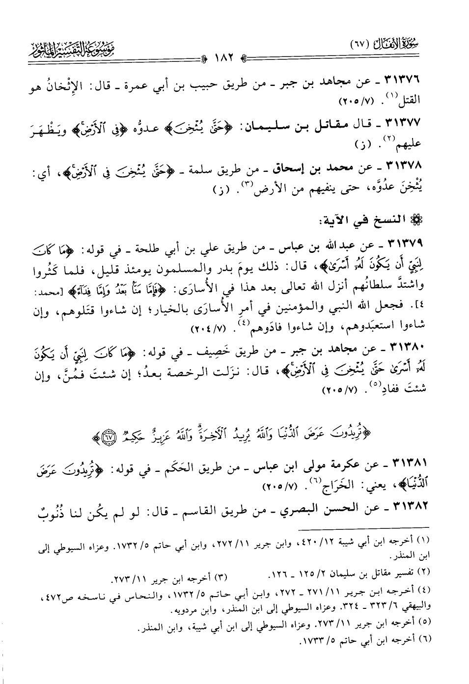 ٣١٣٧٦ - عن مجاهد بن جبر -من طريق حبيب بن أبي عمرة- قال: الإثْخانُ هو القتل (¬١). (٧/ ٢٠٥)
