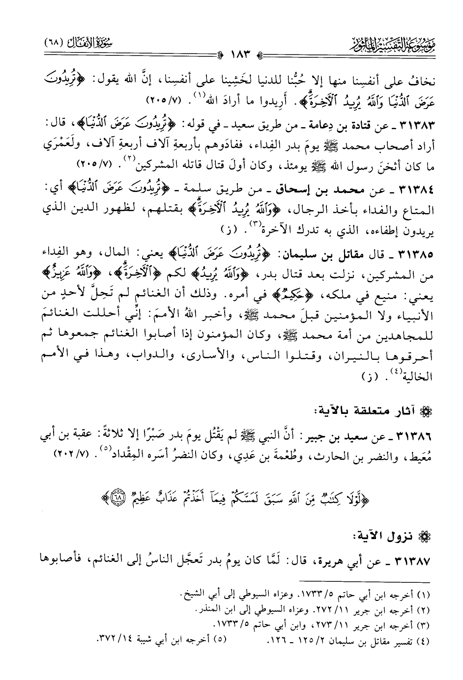 ٣١٣٨٣ - عن قتادة بن دِعامة -من طريق سعيد- في قوله: {تريدون عرض الدنيا}، قال: أراد أصحاب محمد - صلى الله عليه وسلم - يومَ بدر الفِداء، ففادَوهم بأربعةِ آلاف أربعةِ آلاف، ولَعَمْرَي ما كان أثخنَ رسول الله - صلى الله عليه وسلم - يومئذ، وكان أولَ قتال قاتله المشركين (¬٢). (٧/ ٢٠٥)