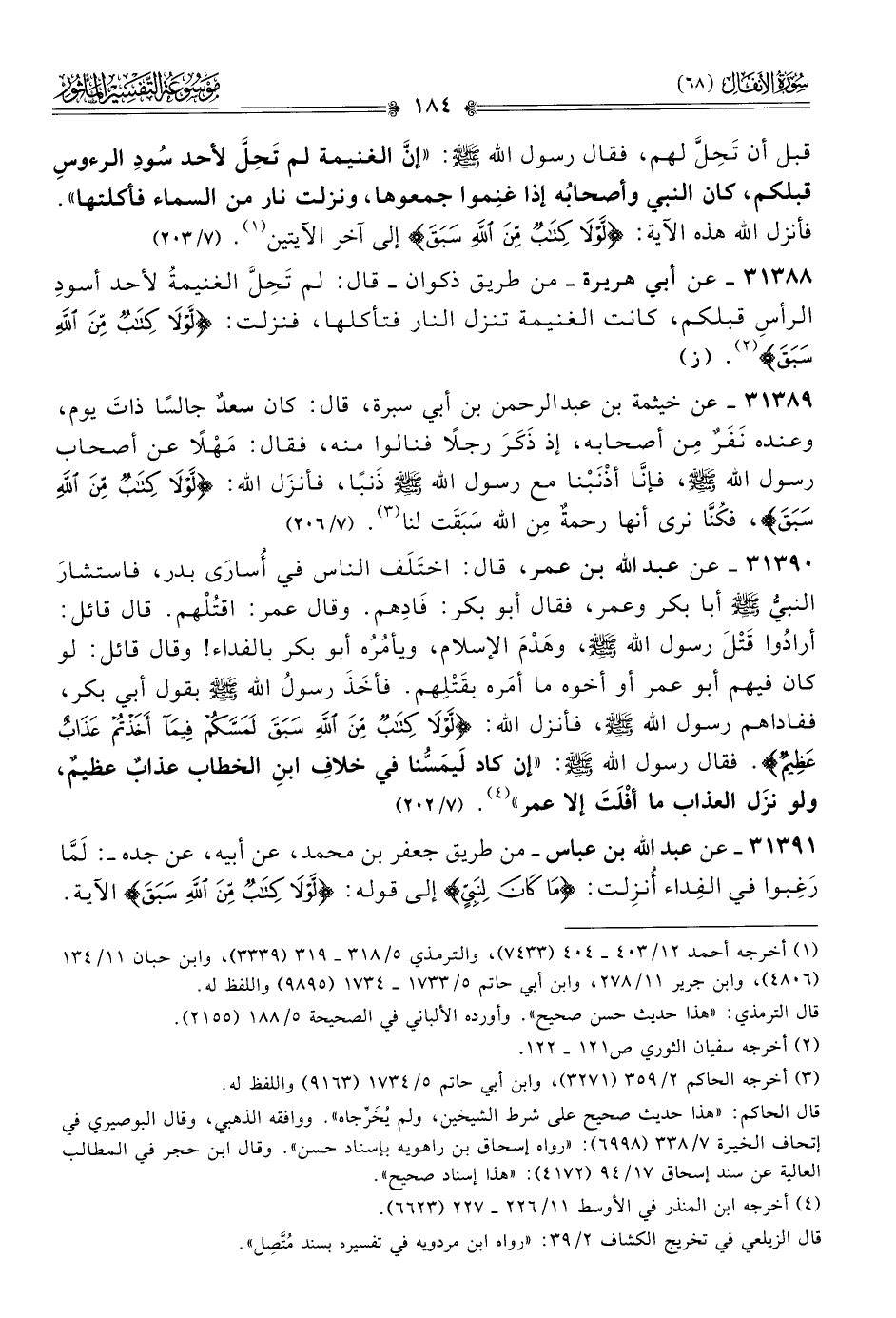 ٣١٣٩١ - عن عبد الله بن عباس -من طريق جعفر بن محمد، عن أبيه، عن جده-: لَمّا رَغِبوا في الفِداء أُنزِلت: {ما كان لنبي} إلى قوله: {لولا كتاب من الله سبق} الآية.