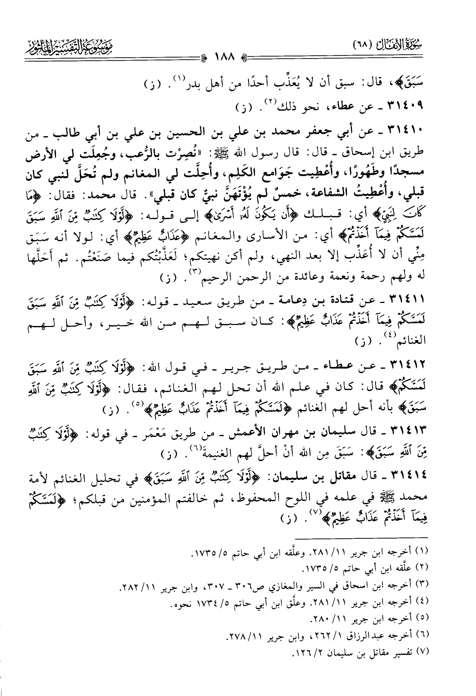 ٣١٤١٠ - عن أبي جعفر محمد بن علي بن الحسين بن علي بن أبي طالب -من طريق ابن إسحاق- قال: قال رسول الله - صلى الله عليه وسلم -: «نُصِرْت بالرُّعب، وجُعِلَت لي الأرض مسجدًا وطَهُورًا، وأُعْطِيت جَوامع الكَلِم، وأُحِلَّت لي المغانم ولم تُحَلَّ لنبي كان قبلي، وأُعْطِيتُ الشفاعة، خمسٌ لم يُؤْتَهَنَّ نبيٌّ كان قبلي». قال محمد: فقال: {ما كان لنبي} أي: قبلك {أن يكون له أسرى} إلى قوله: {لولا كتاب من الله سبق لمسكم فيما أخذتم} أي: من الأسارى والمغانم {عذاب عظيم} أي: لولا أنه سَبَق مِنِّي أن لا أُعَذِّب إلا بعد النهي، ولم أكن نهيتكم؛ لَعَذَّبْتُكم فيما صَنَعْتُم. ثم أحَلَّها له ولهم رحمة ونعمة وعائدة من الرحمن الرحيم (¬٣). (ز)