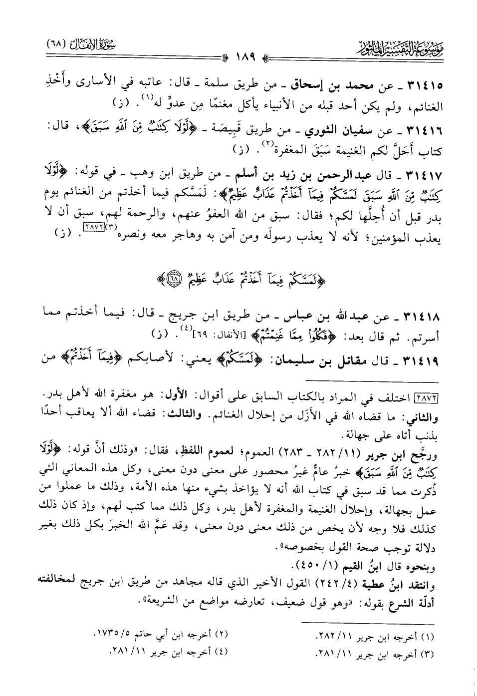 ٣١٤١٧ - قال عبد الرحمن بن زيد بن أسلم -من طريق ابن وهب- في قوله: {لولا كتاب من الله سبق لمسكم فيما أخذتم عذاب عظيم}: لَمَسَّكم فيما أخذتم من الغنائم يوم بدر قبل أن أُحِلَّها لكم؛ فقال: سبق من الله العفوُ عنهم، والرحمة لهم، سبق أن لا يعذب المؤمنين؛ لأنه لا يعذب رسولَه ومن آمن به وهاجر معه ونصره (¬٣) [٢٨٧٢]. (ز)