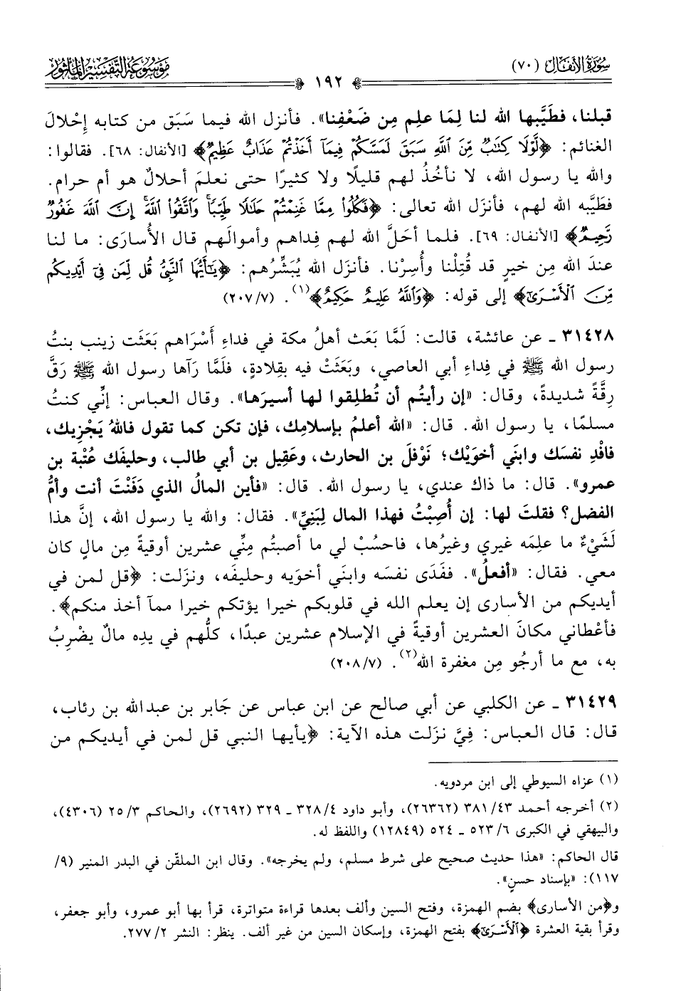 ٣١٤٢٩ - عن الكلبي عن أبي صالح عن ابن عباس عن جابر بن عبدالله بن رئاب، قال: قال العباس: فِيَّ نزَلت هذه الآية: «يأيُّها النَّبِيُّ قُلْ لِّمَن فِي أيْدِيكُم مِّنَ