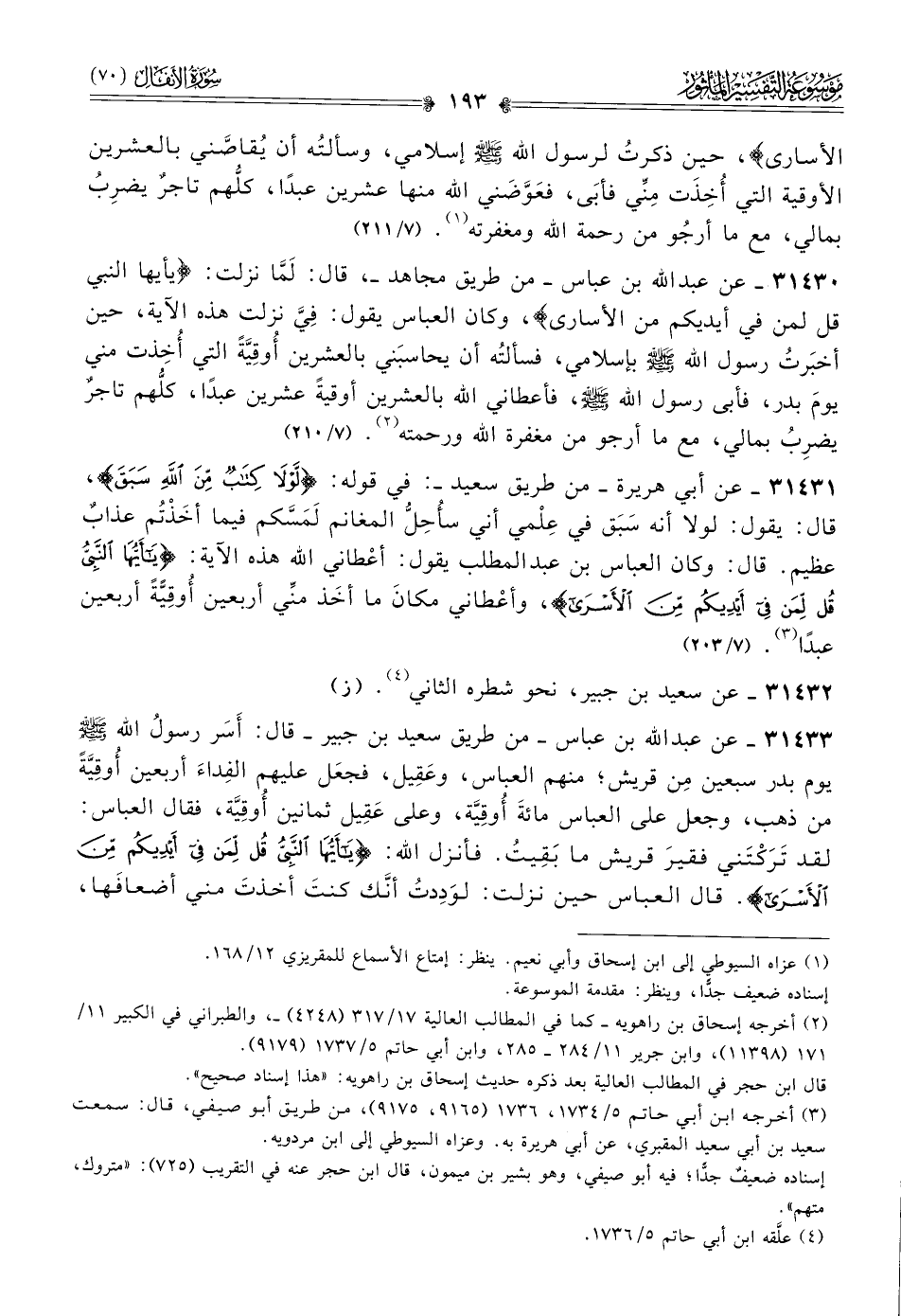 ٣١٤٣٣ - عن عبد الله بن عباس -من طريق سعيد بن جبير- قال: أسَر رسولُ الله - صلى الله عليه وسلم - يوم بدر سبعين مِن قريش؛ منهم العباس، وعَقِيل، فجعَل عليهم الفِداءَ أربعين أُوقِيَّةً من ذهب، وجعل على العباس مائةَ أُوقِيَّة، وعلى عَقِيل ثمانين أُوقِيَّة، فقال العباس: لقد تَرَكْتَني فقيرَ قريش ما بَقِيتُ. فأنزل الله: {يا أيها النَّبِيّ قل لمن في أيديكم من الأسرى}. قال العباس حين نزلت: لوَدِدتُ أنّك كنتَ أخذتَ مني أضعافَها،