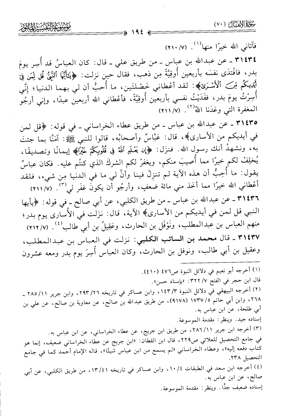 ٣١٤٣٧ - قال محمد بن السائب الكلبي: نزلت في العباس بن عبد المطلب، وعقيل بن أبي طالب، ونوفل بن الحارث، وكان العباس أُسِرَ يوم بدر ومعه عشرون