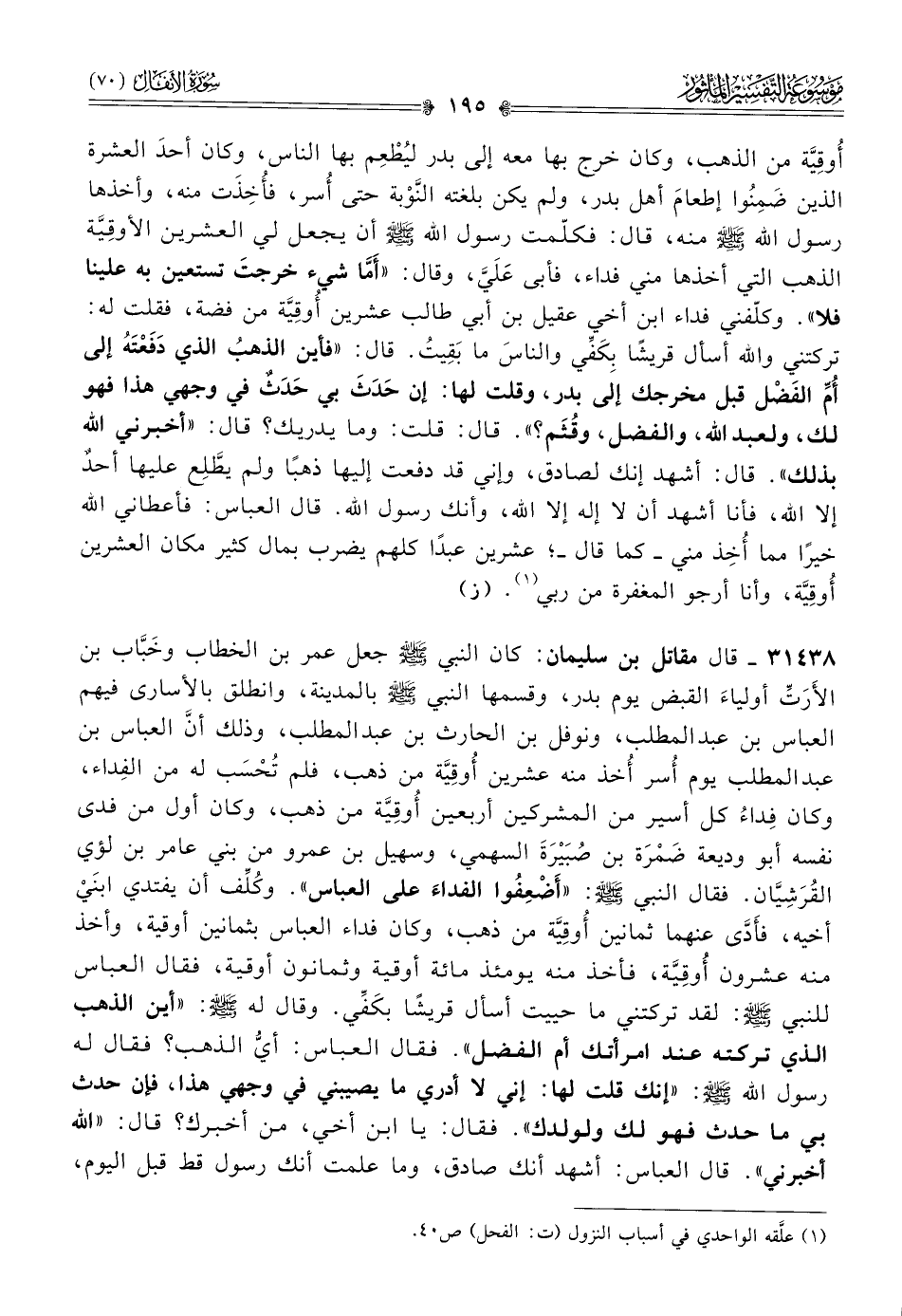 ٣١٤٣٨ - قال مقاتل بن سليمان: كان النبي - صلى الله عليه وسلم - جعل عمر بن الخطاب وخَبّاب بن الأَرَتِّ أولياءَ القبض يوم بدر، وقسمها النبي - صلى الله عليه وسلم - بالمدينة، وانطلق بالأسارى فيهم العباس بن عبد المطلب، ونوفل بن الحارث بن عبد المطلب، وذلك أنّ العباس بن عبد المطلب يوم أُسر أُخذ منه عشرين أُوقِيَّة من ذهب، فلم تُحْسَب له من الفِداء، وكان فِداءُ كل أسير من المشركين أربعين أُوقِيَّة من ذهب، وكان أول من فدى نفسه أبو وديعة ضَمْرَة بن صُبَيْرَةَ السهمي، وسهيل بن عمرو من بني عامر بن لؤي القُرَشِيّان. فقال النبي - صلى الله عليه وسلم -: «أضْعِفُوا الفداءَ على العباس». وكُلِّف أن يفتدي ابنَيْ أخيه، فأَدّى عنهما ثمانين أُوقِيَّة من ذهب، وكان فداء العباس بثمانين أوقية، وأخذ منه عشرون أُوقِيَّة، فأخذ منه يومئذ مائة أوقية وثمانون أوقية، فقال العباس للنبي - صلى الله عليه وسلم -: لقد تركتني ما حييت أسأل قريشًا بكَفِّي. وقال له - صلى الله عليه وسلم -: «أين الذهب الذي تركته عند امرأتك أم الفضل». فقال العباس: أيُّ الذهب؟ فقال له رسول الله - صلى الله عليه وسلم -: «إنك قلت لها: إني لا أدري ما يصيبني في وجهي هذا، فإن حدث بي ما حدث فهو لك ولولدك». فقال: يا ابن أخي، من أخبرك؟ قال: «الله أخبرني». قال العباس: أشهد أنك صادق، وما علمت أنك رسول قط قبل اليوم،