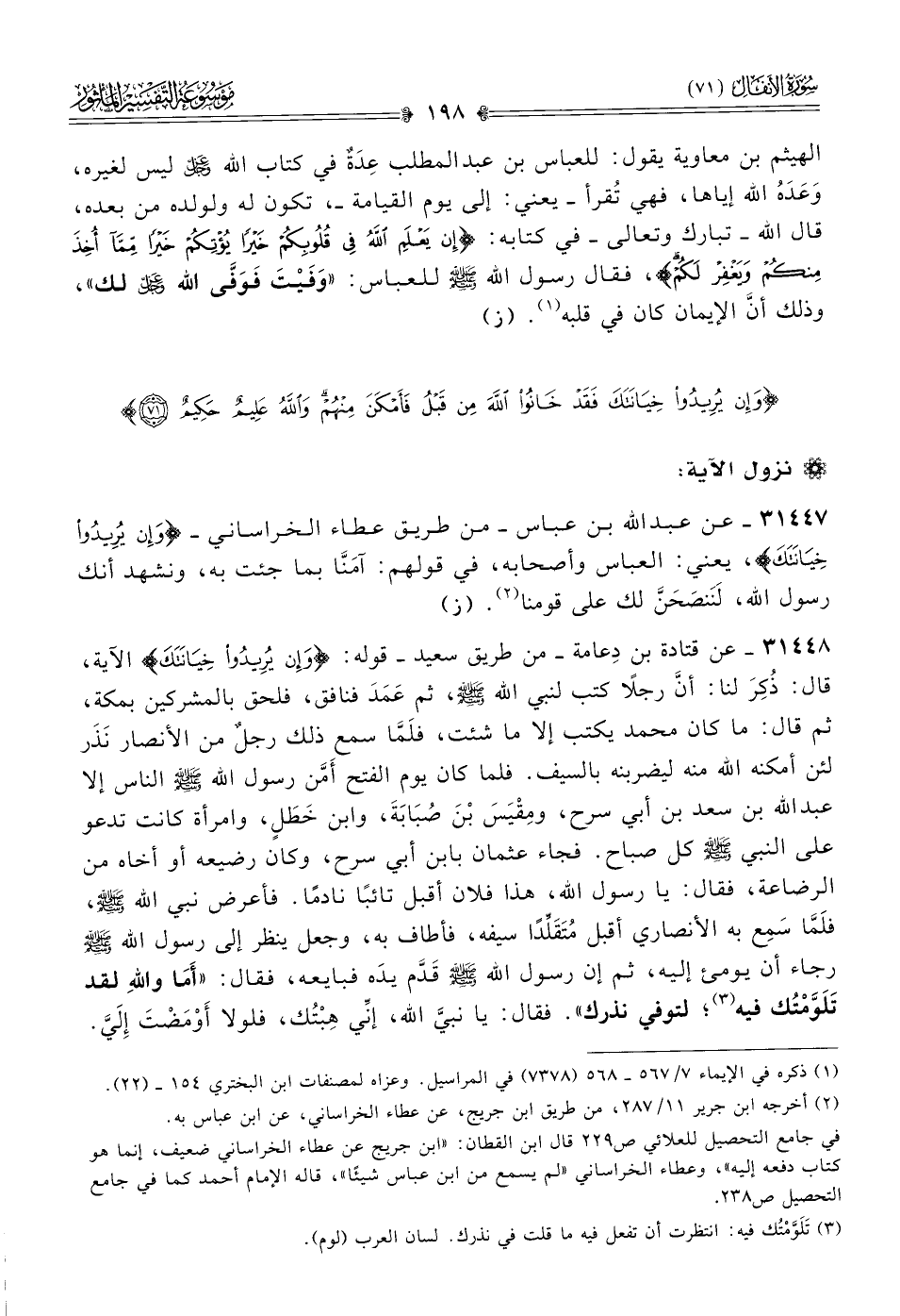 ٣١٤٤٧ - عن عبد الله بن عباس -من طريق عطاء الخراساني- {وإنْ يُرِيدُوا خِيانَتَكَ}، يعني: العباس وأصحابه، في قولهم: آمَنّا بما جئت به، ونشهد أنك رسول الله، لَنَنصَحَنَّ لك على قومنا (¬٢). (ز)