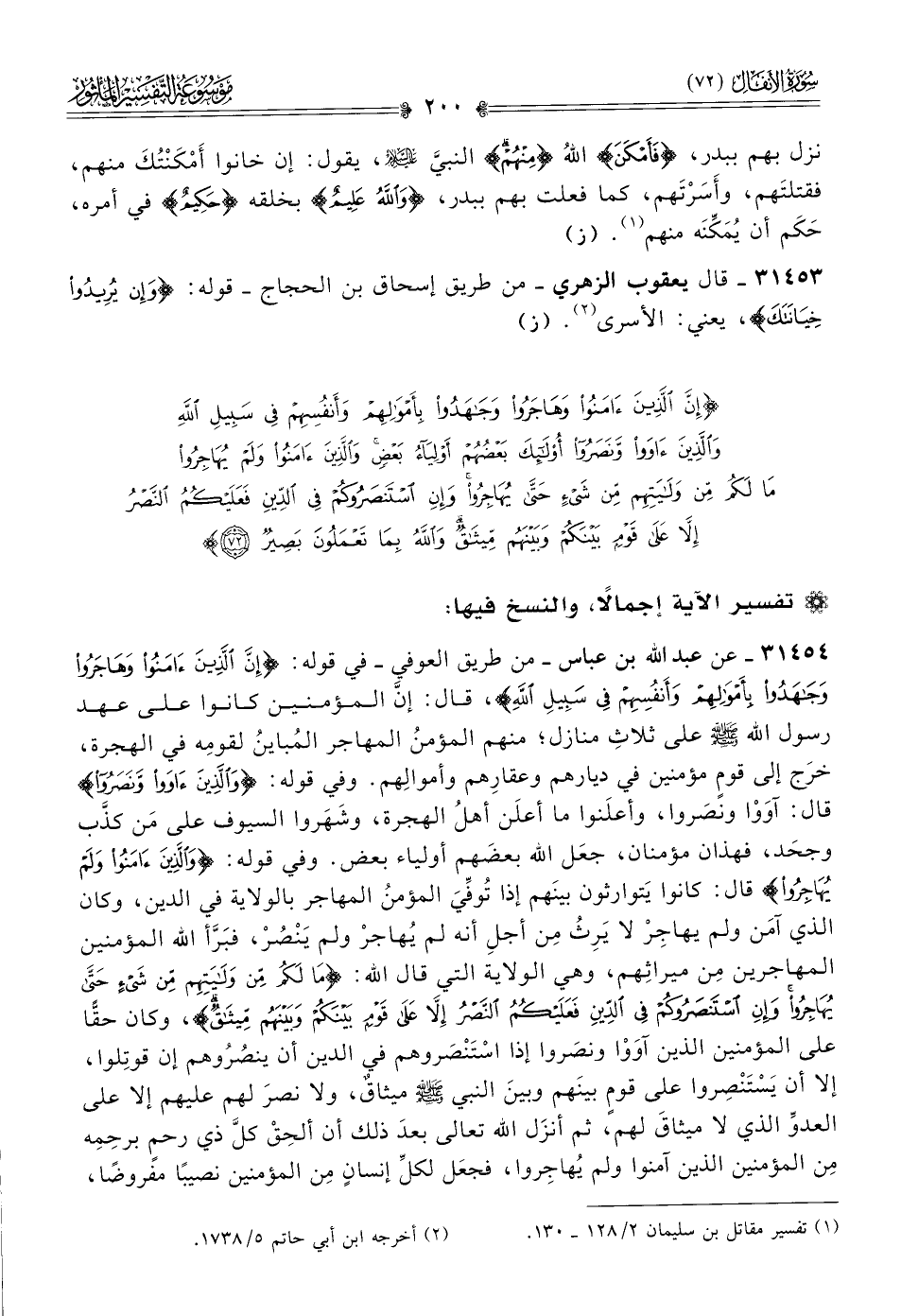 ٣١٤٥٤ - عن عبد الله بن عباس -من طريق العوفي- في قوله: {إن الذين آمنوا وهاجروا وجاهدوا بأموالهم وأنفسهم في سبيل الله}، قال: إنّ المؤمنين كانوا على عهد رسول الله - صلى الله عليه وسلم - على ثلاثِ منازل؛ منهم المؤمنُ المهاجر المُباينُ لقومِه في الهجرة، خرَج إلى قومٍ مؤمنين في ديارهم وعقارِهم وأموالِهم. وفي قوله: {والذين ءاووا ونصروا} قال: آوَوْا ونصَروا، وأعلَنوا ما أعلَن أهلُ الهجرة، وشَهَروا السيوف على مَن كذَّب وجحَد، فهذان مؤمنان، جعَل الله بعضَهم أولياء بعض. وفي قوله: {والذين آمنوا ولم يهاجروا} قال: كانوا يَتوارثون بينَهم إذا تُوفِّيَ المؤمنُ المهاجر بالولاية في الدين، وكان الذي آمَن ولم يهاجِرْ لا يَرِثُ مِن أجلِ أنه لم يُهاجرْ ولم يَنْصُرْ، فبَرَّأ الله المؤمنين المهاجرين مِن ميراثِهم، وهي الولاية التي قال الله: {ما لكم من ولايتهم من شيء حتى يهاجروا وإن استنصروكم في الدين فعليكم النصر إلا على قوم بينكم وبينهم ميثاق}، وكان حقًّا على المؤمنين الذين آوَوْا ونصَروا إذا اسْتَنْصَروهم في الدين أن ينصُرُوهم إن قوتِلوا، إلا أن يَسْتَنْصِروا على قومٍ بينَهم وبينَ النبي - صلى الله عليه وسلم - ميثاقٌ، ولا نصرَ لهم عليهم إلا على العدوِّ الذي لا ميثاقَ لهم، ثم أنزَل الله تعالى بعدَ ذلك أن ألحِقْ كلَّ ذي رحمٍ برحِمِه مِن المؤمنين الذين آمنوا ولم يُهاجِروا، فجعَل لكلِّ إنسانٍ مِن المؤمنين نصيبًا مفروضًا،