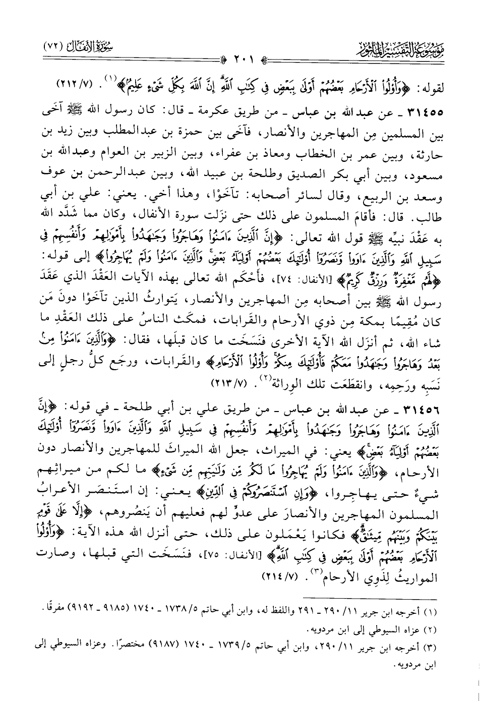 ٣١٤٥٦ - عن عبد الله بن عباس -من طريق علي بن أبي طلحة- في قوله: {إن الذين آمنوا وهاجروا وجاهدوا بأموالهم وأنفسهم في سبيل الله والذين آووا ونصروا أولئك بعضهم أولياء بعض} يعني: في الميراث، جعل الله الميراثَ للمهاجرين والأنصار دون الأرحام، {والذين آمنوا ولم يهاجروا ما لكم من ولايتهم من شيء} ما لكم من ميراثِهم شيءٌ حتى يهاجِروا، {وإن استنصروكم في الدين} يعني: إن استَنصَر الأعرابُ المسلمون المهاجرين والأنصارَ على عدوٍّ لهم فعليهم أن يَنصُروهم، {إلا على قوم بينكم وبينهم ميثاق} فكانوا يَعْمَلون على ذلك، حتى أنزل الله هذه الآية: {وأولو الأرحام بعضهم أولى ببعض في كتاب الله}، فنَسَخَت التي قبلها، وصارت المواريثُ لِذَوِي الأرحام (¬٣). (٧/ ٢١٤)