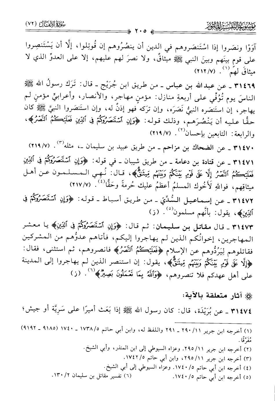 ٣١٤٦٩ - عن عبد الله بن عباس -من طريق ابن جُرَيْج- قال: تَرَك رسولُ الله - صلى الله عليه وسلم - الناسَ يوم تُوُفِّي على أربعةِ منازل: مؤمنٍ مهاجر، والأنصار، وأعرابيٍّ مؤمنٍ لم يهاجر، إن استَنصَره النبيُّ نَصَرَه، وإن ترَكه فهو إذنٌ له، وإن استَنصَروا النبيَّ - صلى الله عليه وسلم - كان حقًّا عليه أن يَنْصُرَهم، وذلك قوله: {وإن استنصروكم في الدين فعليكم النصر}، والرابعة: التابعين بإحسان (¬٢). (٧/ ٢١٩)