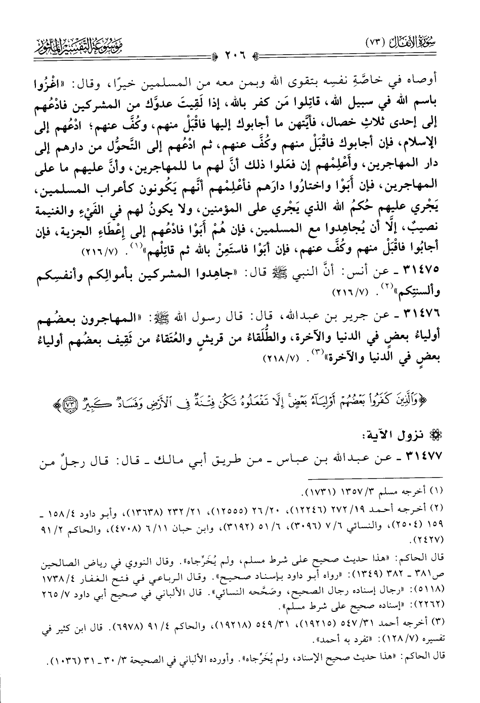 ٣١٤٧٥ - عن أنس، أنّ النبي - صلى الله عليه وسلم - قال: «جاهِدوا المشركين بأموالِكم وأنفسِكم وألسنتِكم» (¬٢). (٧/ ٢١٦)