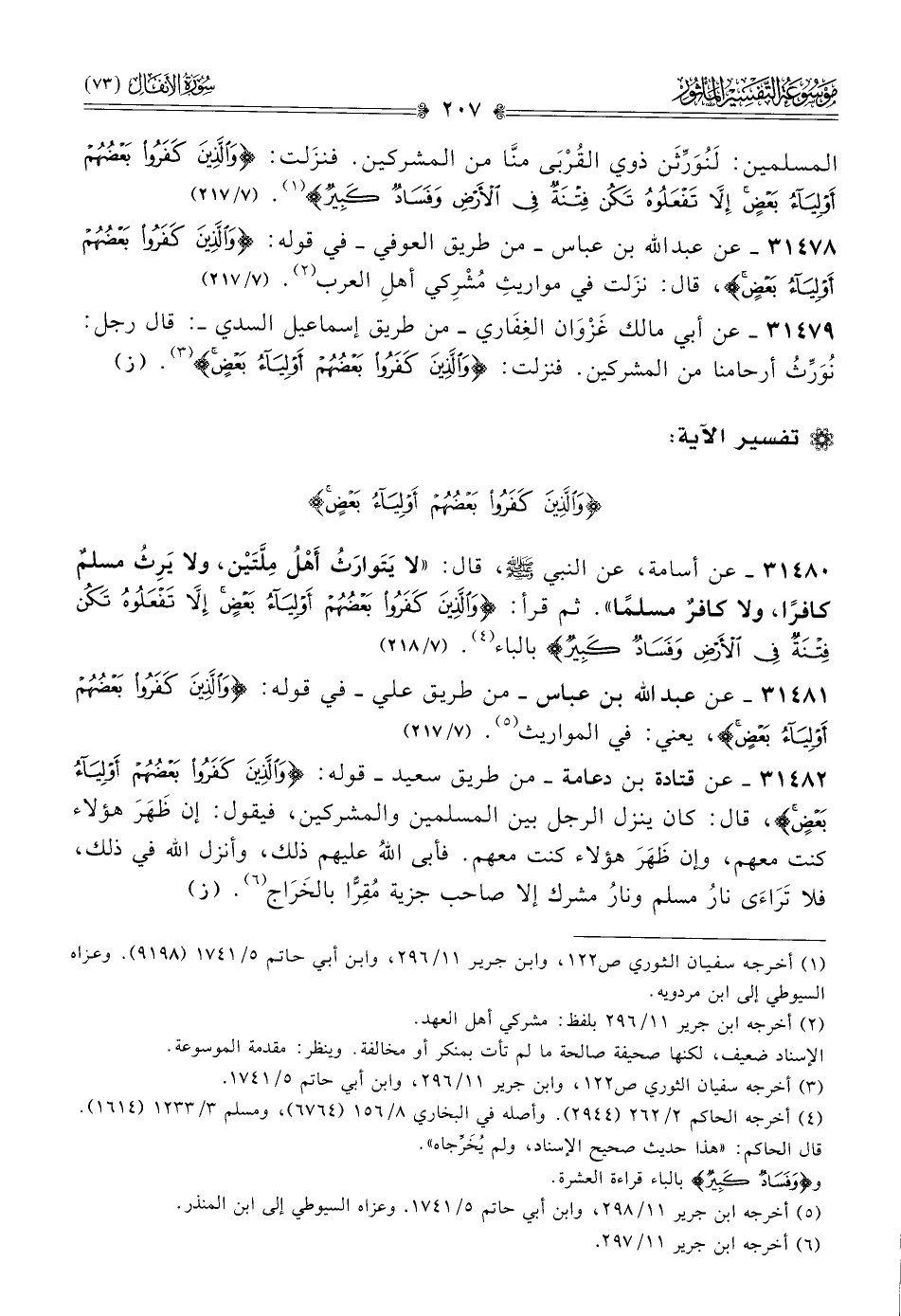 ٣١٤٧٩ - عن أبي مالك غَزْوان الغِفاري -من طريق إسماعيل السدي-: قال رجل: نُوَرِّثُ أرحامنا من المشركين. فنزلت: {والَّذِينَ كَفَرُوا بَعْضُهُمْ أوْلِياءُ بَعْضٍ} (¬٣). (ز)