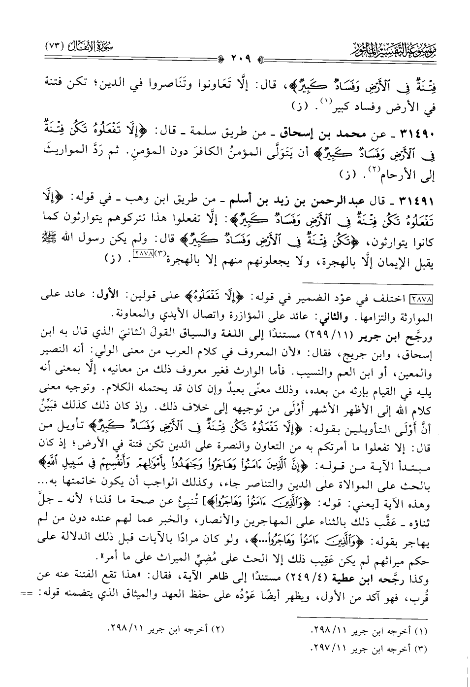 [٢٨٧٨] اختلف في عوْد الضمير في قوله: {إلا تفعلوه} على قولين: الأول: عائد على الموارثة والتزامها. والثاني: عائد على المؤازرة واتصال الأيدي والمعاونة. ورجَّح ابن جرير (١١/ ٢٩٩) مستندًا إلى اللغة والسياق القولَ الثانيَ الذي قال به ابن إسحاق، وابن جريج، فقال: «لأن المعروف في كلام العرب من معنى الولي: أنه النصير والمعين، أو ابن العم والنسيب. فأما الوارث فغير معروف ذلك من معانيه، إلّا بمعنى أنه يليه في القيام بإرثه من بعده، وذلك معنًى بعيدٌ وإن كان قد يحتمله الكلام. وتوجيه معنى كلام الله إلى الأظهر الأشهر أوْلى من توجيهه إلى خلاف ذلك. وإذ كان ذلك كذلك فبَيِّنٌ أنّ أوْلى التأويلين بقوله: {إلا تفعلوه تكن فتنة في الأرض وفساد كبير} تأويل من قال: إلا تفعلوا ما أمرتكم به من التعاون والنصرة على الدين تكن فتنة في الأرض؛ إذ كان مبتدأ الآية من قوله: {إن الذين آمنوا وهاجروا وجاهدوا بأموالهم وأنفسهم في سبيل الله} بالحث على الموالاة على الدين والتناصر جاء، وكذلك الواجب أن يكون خاتمتها به ... وهذه الآية [يعني: قوله: {والذين آمنوا وهاجروا}] تُنبِئُ عن صحة ما قلنا؛ لأنه -جل ثناؤه- عَقَّب ذلك بالثناء على المهاجرين والأنصار، والخبر عما لهم عنده دون من لم يهاجر بقوله: {والذين آمنوا وهاجروا ... }، ولو كان مرادًا بالآيات قبل ذلك الدلالة على حكم ميراثهم لم يكن عَقِيب ذلك إلا الحث على مُضِيِّ الميراث على ما أمر».