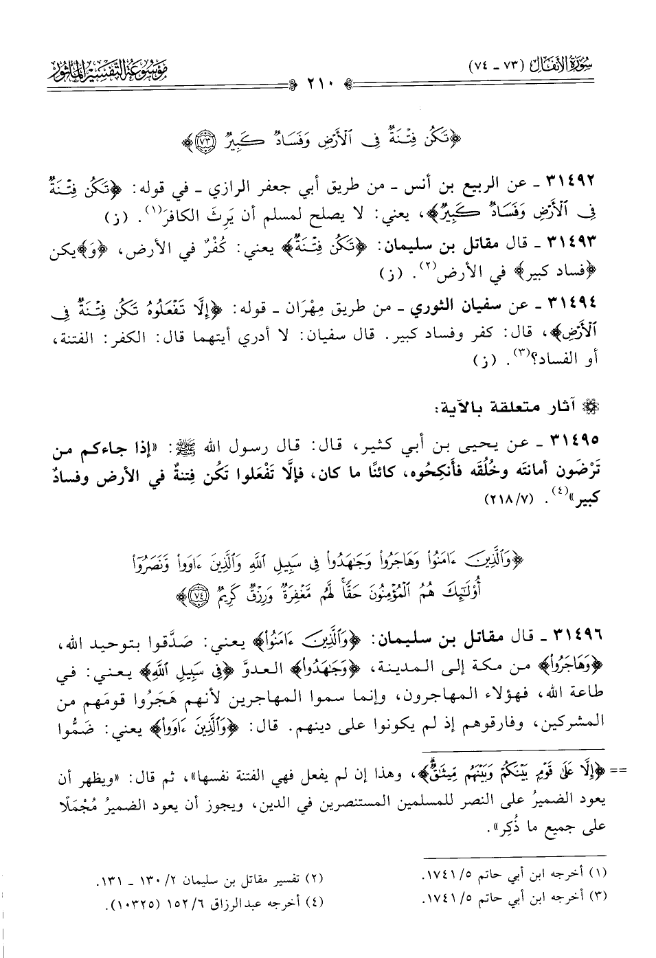 ٣١٤٩٤ - عن سفيان الثوري -من طريق مِهْران- قوله: {إلا تفعلوه تكن فتنة في الأرض}، قال: كفر وفساد كبير. قال سفيان: لا أدري أيتهما قال: الكفر: الفتنة، أو الفساد؟ (¬٣). (ز)