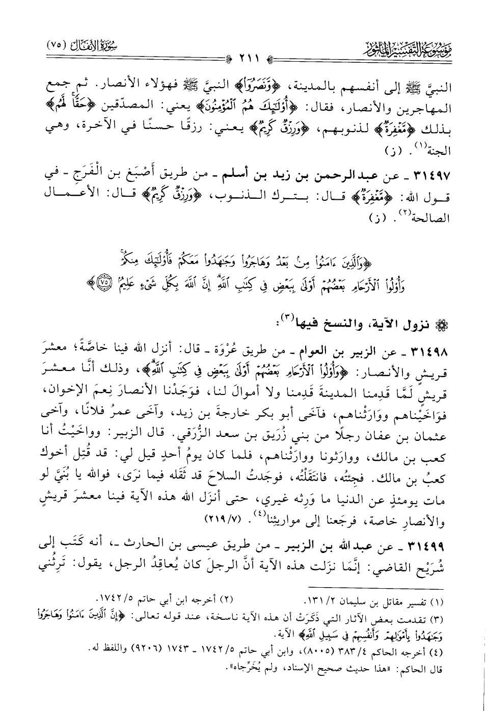 (¬٣) تقدمت بعض الآثار التي ذَكَرَتْ أن هذه الاية ناسخة، عند قوله تعالى: {إِنَّ الَّذِينَ آمَنُوا وَهَاجَرُوا وَجَاهَدُوا بِأَمْوَالِهِمْ وَأَنْفُسِهِمْ فِي سَبِيلِ اللَّهِ} الآية.