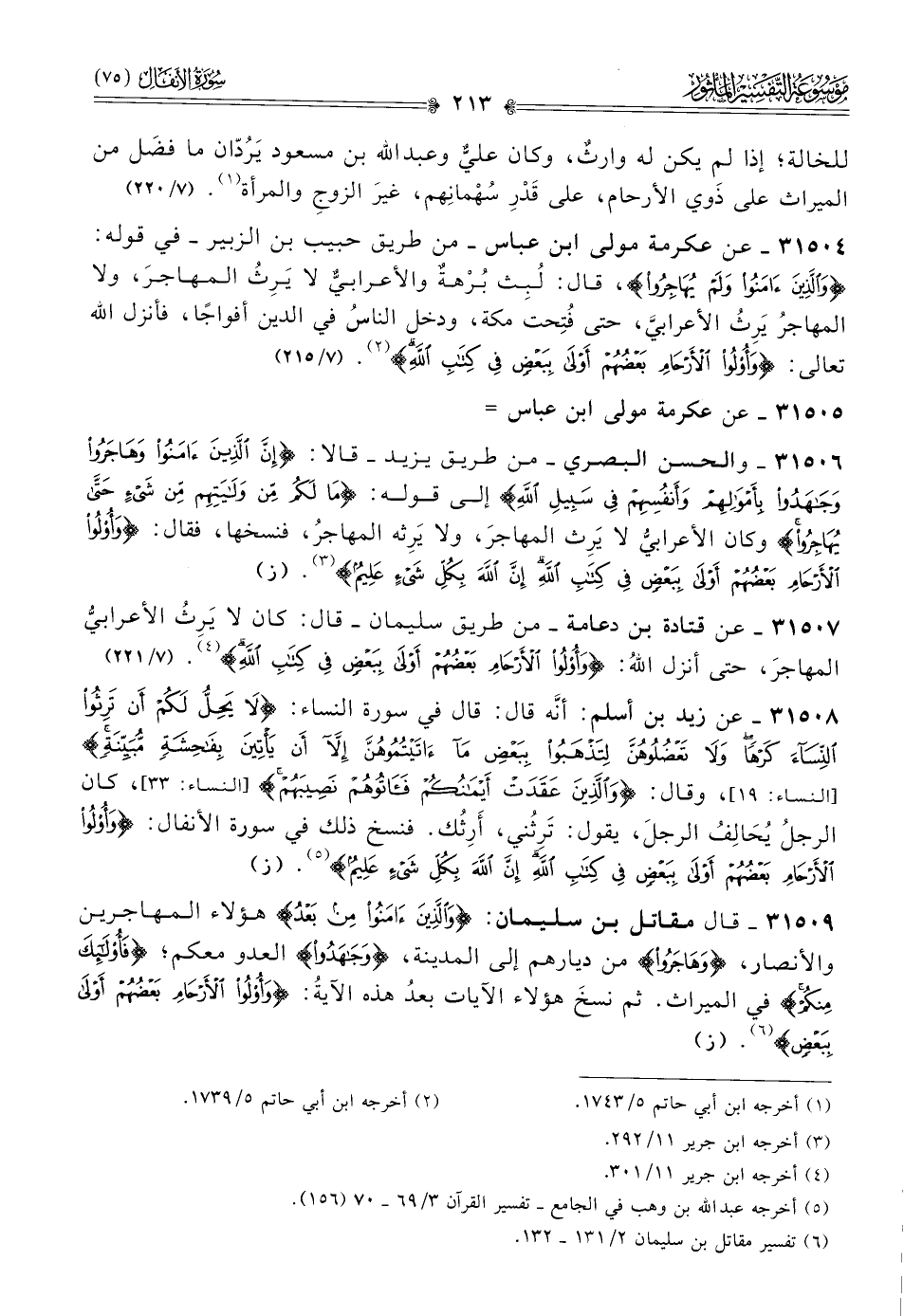٣١٥٠٤ - عن عكرمة مولى ابن عباس -من طريق حبيب بن الزبير- في قوله: {والذين آمنوا ولم يهاجروا}، قال: لُبِث بُرْهةٌ والأعرابيٌّ لا يَرِثُ المهاجرَ، ولا المهاجرُ يَرِثُ الأعرابيَّ، حتى فُتِحت مكة، ودخل الناسُ في الدين أفواجًا، فأنزل الله تعالى: {وأولو الأرحام بعضهم أولى ببعض في كتاب الله} (¬٢). (٧/ ٢١٥)