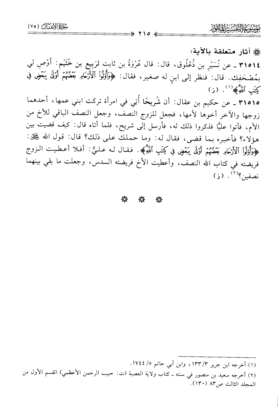 (¬٢) أخرجه سنن سعيد بن منصور في سننه -كتاب ولاية العصبة (ت: حبيب الرحمن الأعظمي) القسم الأول من المجلد الثالث ص ٨٣ (١٣٠).