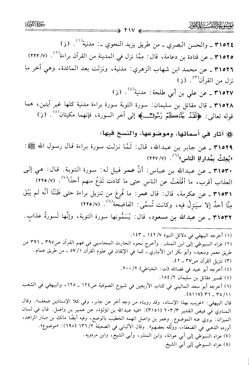٣١٥٣٢ - عن عبد الله بن مسعود، قال: يُسَمُّونها سورة التوبة، وإنّها لَسورةُ عذابٍ.