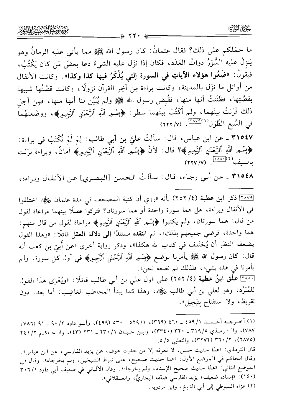 [٢٨٧٩] ذكر ابن عطية (٤/ ٢٥٢) بأنه «روي أن كتبة المصحف في مدة عثمان - رضي الله عنهما - اختلفوا في الأنفال وبراءة، هل هما سورة واحدة أو هما سورتان؟ فتركوا فصلا بينهما مراعاة لقول من قال: هما سورتان، ولم يكتبوا {بِسْمِ الله الرَّحْمَنِ الرَّحِيم} مراعاة لقول من قال منهم: هما واحدة، فرضي جميعهم بذلك»، ثم انتقده مستندًا إلى دلالة العقل قائلًا: «وهذا القول يضعفه النظر أن يُختَلف في كتاب الله هكذا»، وذكر رواية أخرى «عن أبيّ بن كعب أنه قال: كان رسول الله - صلى الله عليه وسلم - يأمرنا بوضع {بسم الله الرحمن الرحيم} في أول كل سورة، ولم يأمرنا في هذه بشيء، فلذلك لم نضعه نحن».