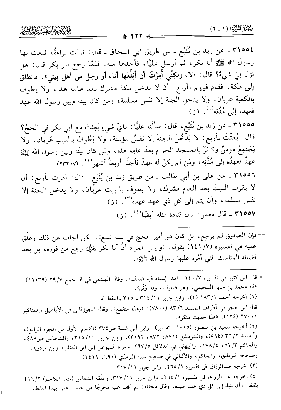 ٣١٥٥٤ - عن زيد بن يُثَيْع -من طريق أبي إسحاق- قال: نزلت براءةُ، فبعث بها رسولُ الله - صلى الله عليه وسلم - أبا بكر، ثم أرسل عليًّا، فأخذها منه. فلمّا رجع أبو بكر قال: هل نزل فِيَّ شيءٌ؟ قال: «لا، ولكِنِّي أُمِرْتُ أن أُبَلِّغَها أنا، أو رجل من أهل بيتي». فانطلق إلى مكة، فقام فيهم بأربع: أن لا يدخل مكة مشرك بعد عامه هذا، ولا يطوف بالكعبة عريان، ولا يدخل الجنة إلا نفس مسلمة، ومَن كان بينه وبين رسول الله عهد فعهده إلى مُدَّته (¬١). (ز)