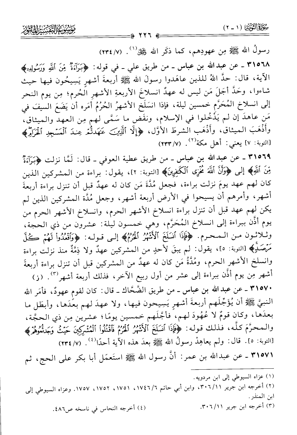 ٣١٥٦٩ - عن عبد الله بن عباس -من طريق عطية العوفي- قال: لَمّا نزلت {براءة من الله} إلى {وأن الله مخزي الكافرين}، يقول: براءة من المشركين الذين كان لهم عهد يومَ نزلت براءة، فجعل مُدَّةَ مَن كان له عهدٌ قبل أن تنزل براءة أربعةَ أشهر، وأمرهم أن يسيحوا في الأرض أربعة أشهر، وجعل مُدَّة المشركين الذين لم يكن لهم عهد قبل أن تنزل براءة انسلاخ الأشهر الحرم، وانسلاخ الأشهر الحرم من يوم أذَّن ببراءة إلى انسلاخ المُحَرَّم، وهي خمسون ليلة: عشرون من ذي الحجة، وثلاثون من المحرم. {فإذا انسلخ الأشهر الحرم} إلى قوله: {واقعدوا لهم كل مرصد}، يقول: لم يبقَ لأحدٍ من المشركين عهدٌ ولا ذِمَّةٌ منذ نزلت براءة وانسلخ الأشهر الحرم، ومُدَّةُ مَن كان له عهدٌ من المشركين قبل أن تنزل براءة أربعةَ أشهر مِن يوم أذَّن ببراءة إلى عشر من أول ربيع الآخر، فذلك أربعة أشهر (¬٣). (ز)