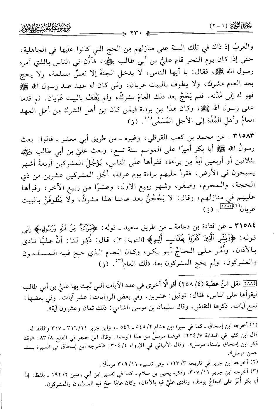 ٣١٥٨٤ - عن قتادة بن دعامة -من طريق سعيد- قوله: {براءة من الله ورسوله} إلى قوله: {وبشر الذين كفروا بعذاب أليم}، قال: ذُكِر لنا: أنّ عليًّا نادى بالأذان، وأُمِّر على الحاجِّ أبو بكر، وكان العام الذي حج فيه المسلمون والمشركون، ولم يحج المشركون بعد ذلك العام (¬٣). (ز)