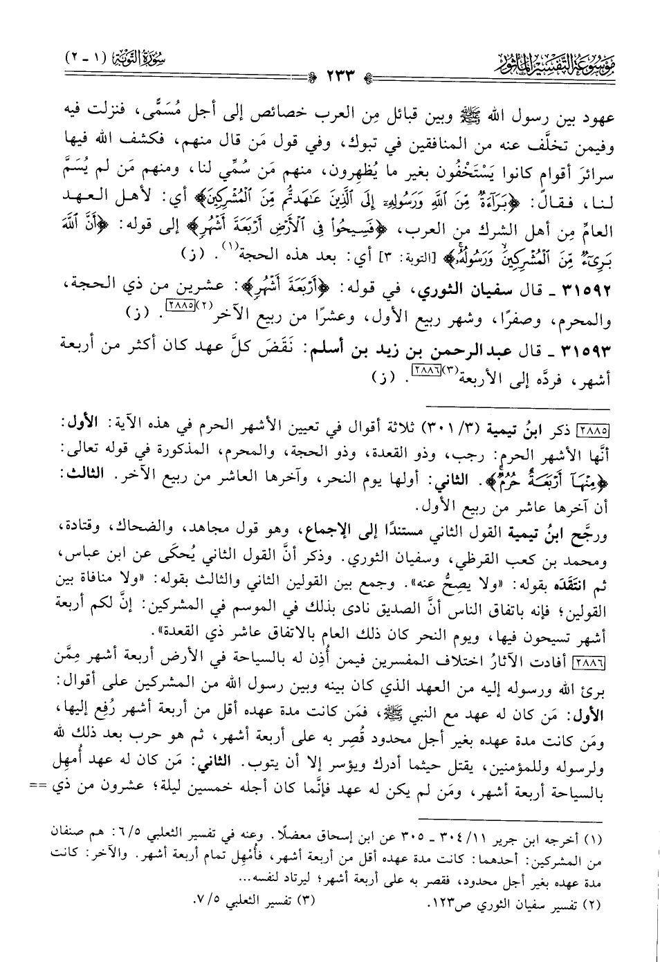 [٢٨٨٥] ذكر ابنُ تيمية (٣/ ٣٠١) ثلاثة أقوال في تعيين الأشهر الحرم في هذه الآية: الأول: أنّها الأشهر الحرم: رجب، وذو القعدة، وذو الحجة، والمحرم، المذكورة في قوله تعالى: {منها أربعة حرم}. الثاني: أولها يوم النحر، وآخرها العاشر من ربيع الآخر. الثالث: أن آخرها عاشر من ربيع الأول. ورجَّح ابنُ تيمية القول الثاني مستندًا إلى الإجماع، وهو قول مجاهد، والضحاك، وقتادة، ومحمد بن كعب القرظي، وسفيان الثوري. وذكر أنّ القول الثاني يُحكى عن ابن عباس، ثم انتَقَدَه بقوله: «ولا يصِحُّ عنه». وجمع بين القولين الثاني والثالث بقوله: «ولا منافاة بين القولين؛ فإنه باتفاق الناس أنّ الصديق نادى بذلك في الموسم في المشركين: إنّ لكم أربعة أشهر تسيحون فيها، ويوم النحر كان ذلك العام بالاتفاق عاشر ذي القعدة».