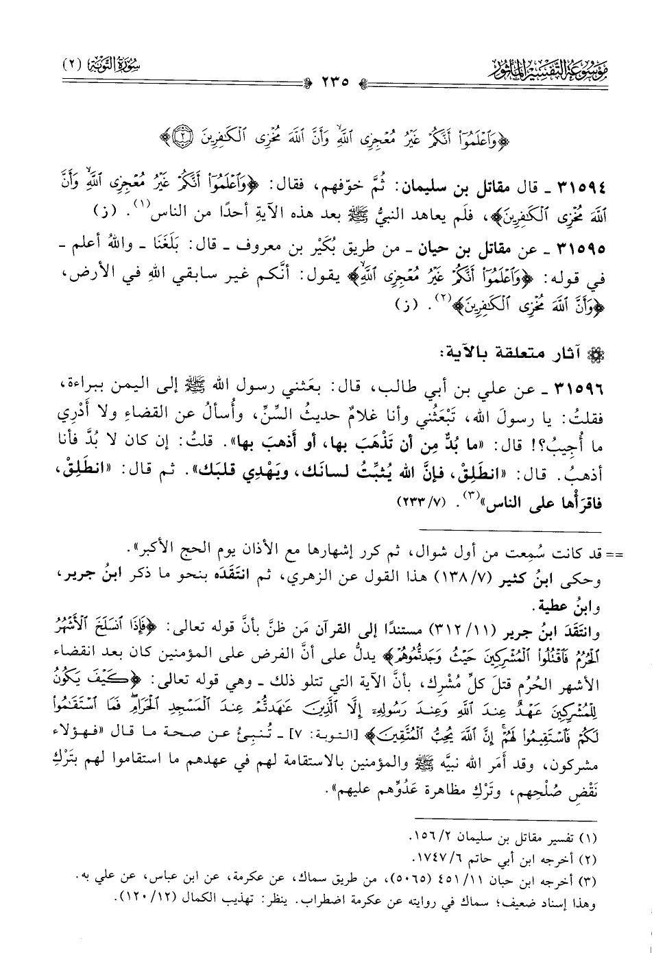 ٣١٥٩٤ - قال مقاتل بن سليمان: ثُمَّ خوّفهم، فقال: {واعْلَمُوا أنَّكُمْ غَيْرُ مُعْجِزِي اللَّهِ وأَنَّ اللَّهَ مُخْزِي الكافِرِينَ}، فلَم يعاهد النبيُّ - صلى الله عليه وسلم - بعد هذه الآيةِ أحدًا من الناس (¬١). (ز)