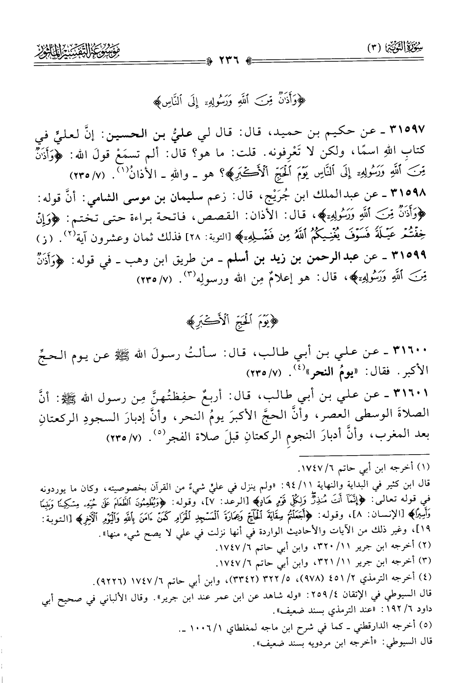 ٣١٦٠٠ - عن علي بن أبي طالب، قال: سألتُ رسولَ الله - صلى الله عليه وسلم - عن يوم الحجِّ الأكبر. فقال: «يومُ النحر» (¬٤). (٧/ ٢٣٥)