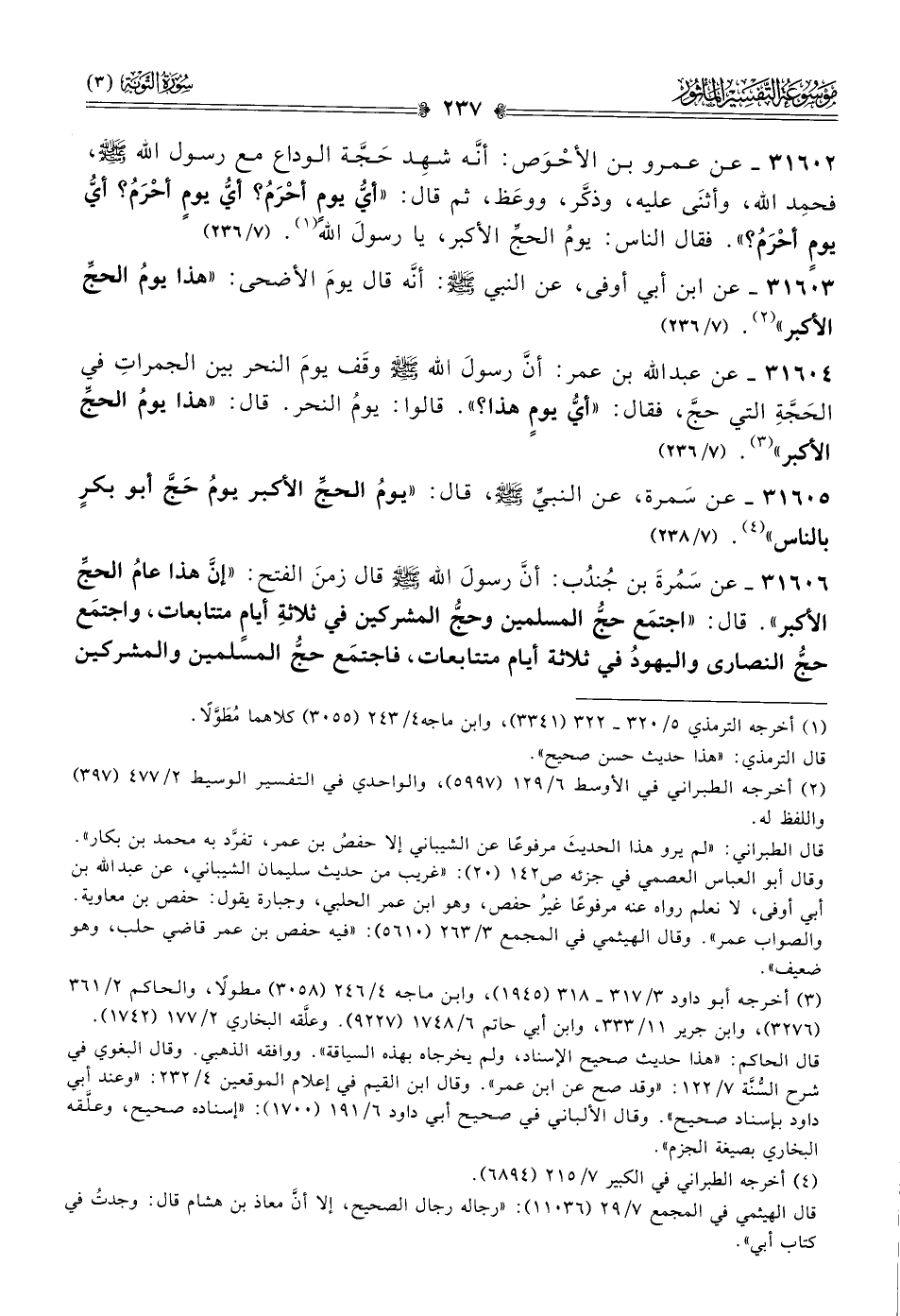 ٣١٦٠٢ - عن عمرو بن الأحْوَص: أنّه شهِد حَجَّة الوداع مع رسول الله - صلى الله عليه وسلم -، فحمِد الله، وأثنى عليه، وذكَّر، ووعَظ، ثم قال: «أيُّ يومٍ أحْرَمُ؟ أيُّ يومٍ أحْرَمُ؟ أيُّ يومٍ أحْرَمُ؟». فقال الناس: يومُ الحجِّ الأكبر، يا رسولَ الله (¬١). (٧/ ٢٣٦)