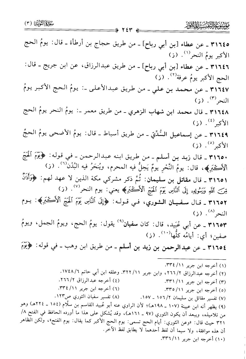 ٣١٦٥٢ - قال سفيان الثوري، في قوله: {إلى الناس يوم الحج الأكبر}: يوم النحر (¬٨). (ز)