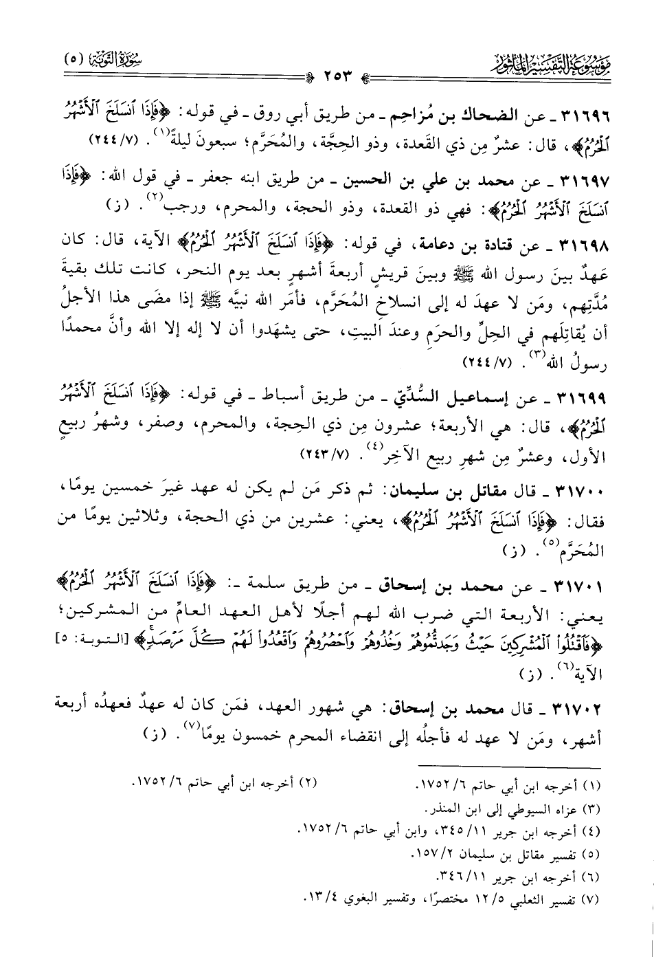 ٣١٦٩٦ - عن الضحاك بن مُزاحِم -من طريق أبي روق- في قوله: {فإذا انسلخ الأشهر الحرم}، قال: عشرٌ مِن ذي القَعدة، وذو الحِجَّة، والمُحَرَّم؛ سبعونَ ليلةً (¬١). (٧/ ٢٤٤)