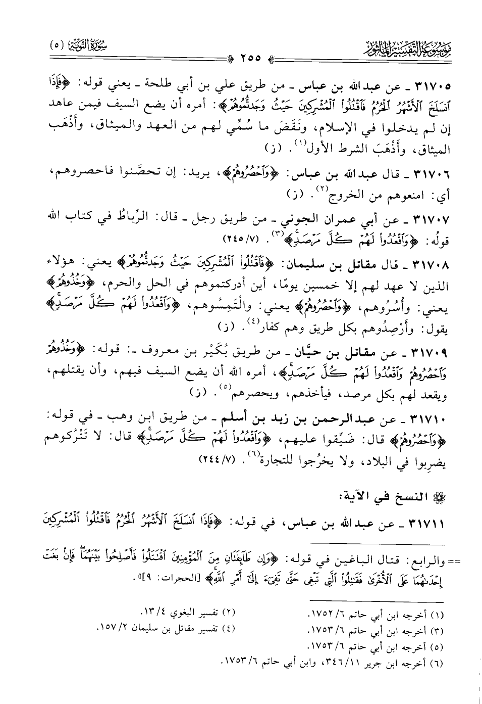 ٣١٧٠٥ - عن عبد الله بن عباس -من طريق علي بن أبي طلحة- يعني قوله: {فإذا انسلخ الأشهر الحرم فاقتلوا المشركين حيث وجدتموهم}: أمره أن يضع السيف فيمن عاهد إن لم يدخلوا في الإسلام، ونَقَضَ ما سُمِّي لهم من العهد والميثاق، وأَذْهَب الميثاق، وأَذْهَبَ الشرط الأول (¬١). (ز)