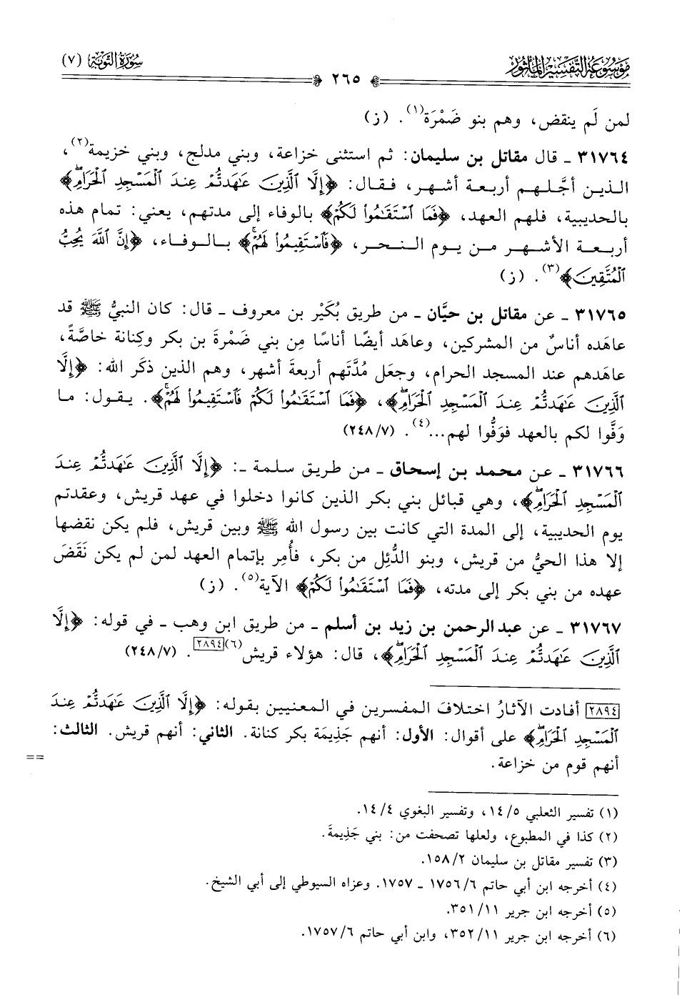 ٣١٧٦٧ - عن عبد الرحمن بن زيد بن أسلم -من طريق ابن وهب- في قوله: {إلا الذين عاهدتم عند المسجد الحرام}، قال: هؤلاء قريش (¬٦) [٢٨٩٤]. (٧/ ٢٤٨)