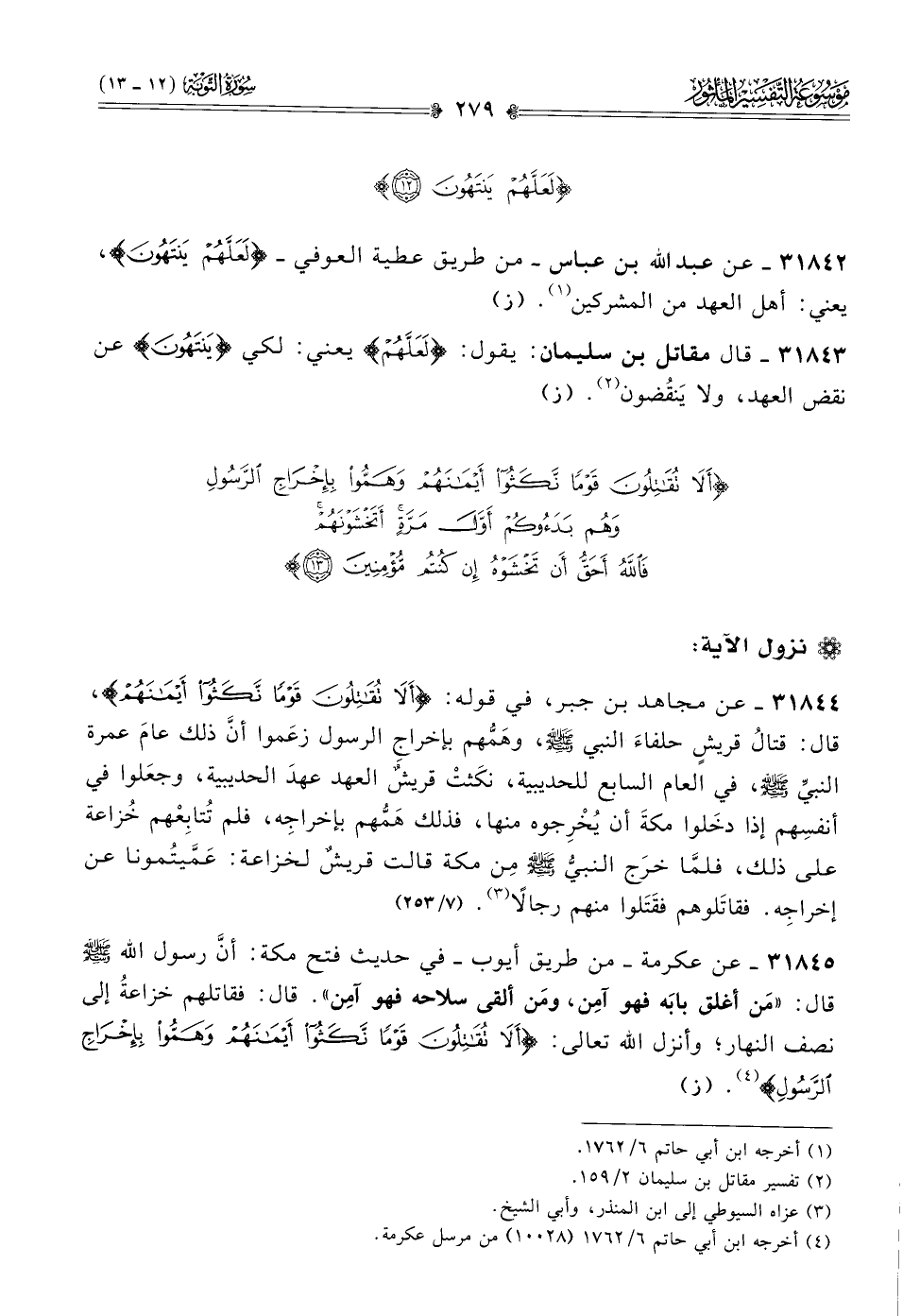 ٣١٨٤٢ - عن عبد الله بن عباس -من طريق عطية العوفي- {لعلهم ينتهون}، يعني: أهل العهد من المشركين (¬١). (ز)