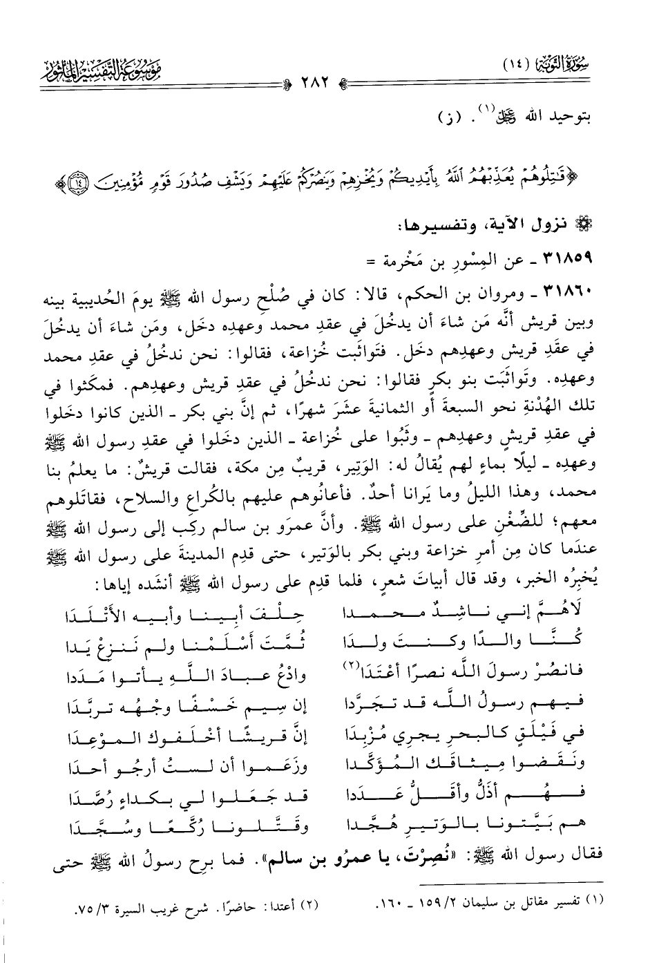 ٣١٨٦٠ - ومروان بن الحكم، قالا: كان في صُلْحِ رسول الله - صلى الله عليه وسلم - يومَ الحُديبية بينه وبين قريش أنّه مَن شاءَ أن يدخُلَ في عقدِ محمد وعهدِه دخَل، ومَن شاءَ أن يدخُلَ في عقَدِ قريش وعهدِهم دخَل. فتَواثَبت خُزاعة، فقالوا: نحن ندخُلُ في عقدِ محمد وعهدِه. وتَواثَبَت بنو بكرٍ فقالوا: نحن ندخُلُ في عقدِ قريش وعهدِهم. فمكَثوا في تلك الهُدْنةِ نحو السبعةَ أو الثمانيةَ عشَرَ شهرًا، ثم إنّ بني بكر -الذين كانوا دخَلوا في عقدِ قريشٍ وعهدِهم- وثَبُوا على خُزاعة -الذين دخَلوا في عقدِ رسول الله - صلى الله عليه وسلم - وعهدِه- ليلًا بماءٍ لهم يُقالُ له: الوَتِير، قريبٌ مِن مكة، فقالت قريشٌ: ما يعلمُ بنا محمد، وهذا الليلُ وما يَرانا أحدٌ. فأعانُوهم عليهم بالكُراعِ والسلاح، فقاتَلوهم معهم؛ للضِّغْنِ على رسول الله - صلى الله عليه وسلم -. وأنّ عمرَو بن سالم ركِب إلى رسول الله - صلى الله عليه وسلم - عندَما كان مِن أمرِ خزاعة وبني بكر بالوَتير، حتى قدِم المدينةَ على رسول الله - صلى الله عليه وسلم - يُخبِرُه الخبر، وقد قال أبياتَ شعرٍ، فلما قدِم على رسول الله - صلى الله عليه وسلم - أنشَده إياها:
