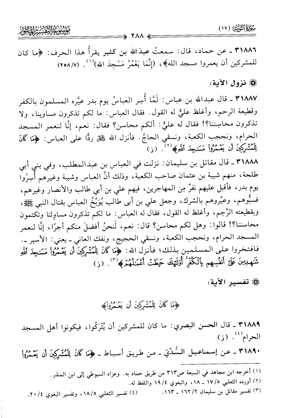 ٣١٨٨٧ - قال عبد الله بن عباس: لَمّا أُسِر العباسُ يوم بدر عيَّره المسلمون بالكفر وقطيعة الرحم، وأغلظ عليٌّ له القول. فقال العباس: ما لكم تذكرون مساوينا، ولا تذكرون محاسِننا؟! فقال له عليٌّ: ألكم محاسن؟ فقال: نعم، إنّا لنعمر المسجد الحرام، ونحجب الكعبة، ونسقي الحاجَّ. فأنزل الله - عز وجل - ردًّا على العباس: {ما كان للمشركين أن يعمروا مساجد الله} (¬٢). (ز)
