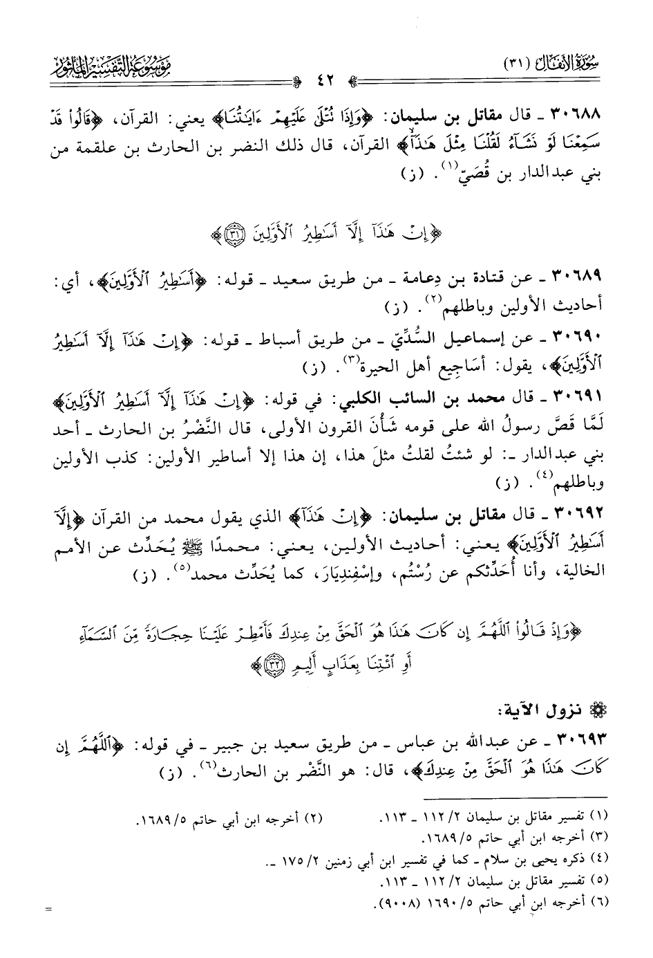 ٣٠٦٩٠ - عن إسماعيل السُّدِّيّ -من طريق أسباط- قوله: {إن هذا إلا أساطير الأولين}، يقول: أساجِيع أهل الحيرة (¬٣). (ز)