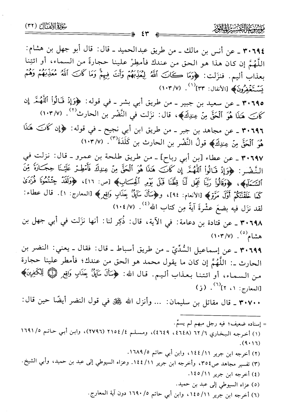 ٣٠٦٩٦ - عن مجاهد بن جبر -من طريق ابن أبي نجيح- في قوله: {إن كان هذا هو الحق من عندك} قولُ النَّضْر بن الحارث بن كَلَدَةَ (¬٣). (٧/ ١٠٣)