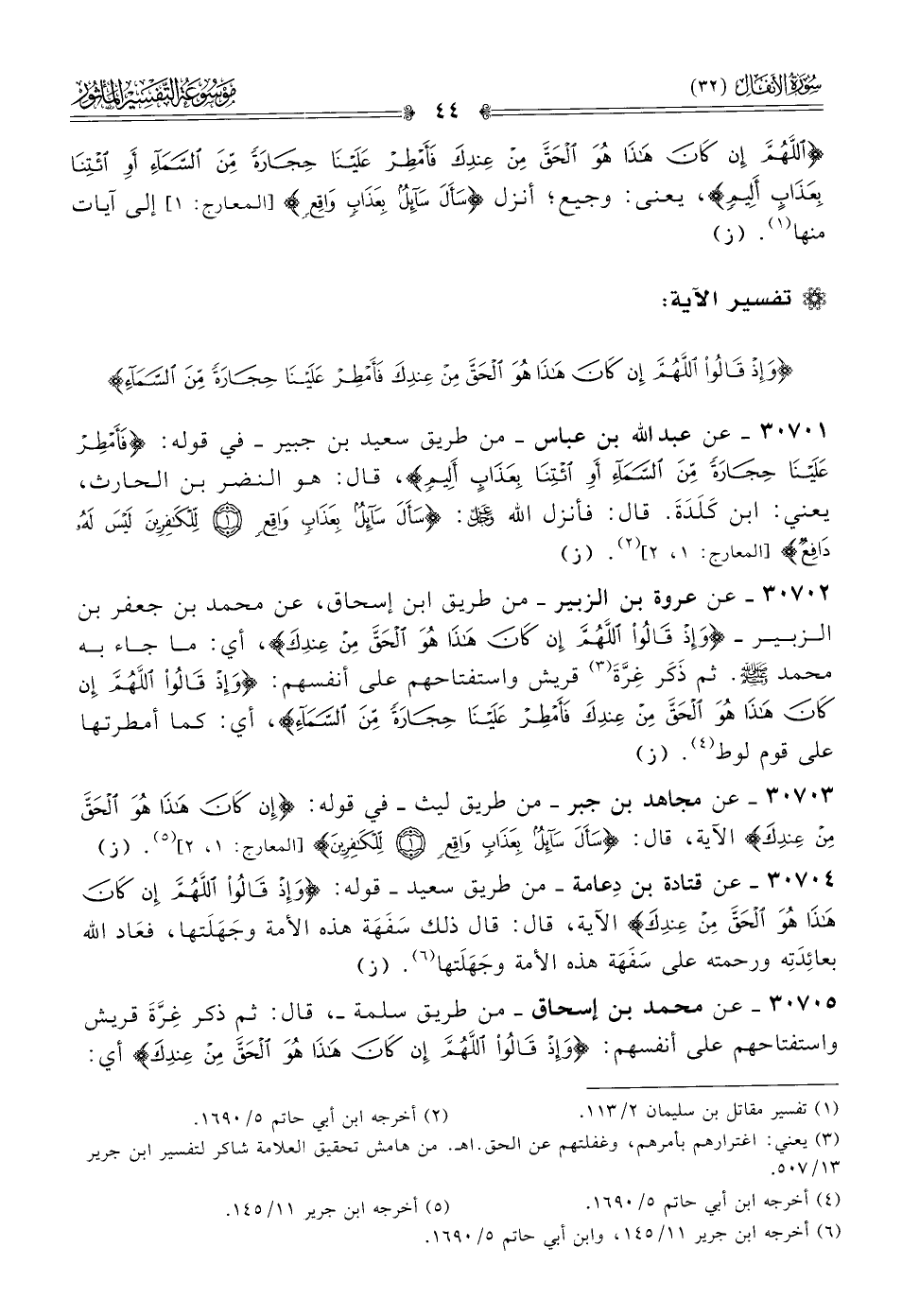 ٣٠٧٠٢ - عن عروة بن الزبير -من طريق ابن إسحاق، عن محمد بن جعفر بن الزبير- {وإذ قالوا اللهم إن كان هذا هو الحق من عندك}، أي: ما جاء به محمد - صلى الله عليه وسلم -. ثم ذَكَر غِرَّةَ (¬٣) قريش واستفتاحهم على أنفسهم: {وإذ قالوا اللهم إن كان هذا هو الحق من عندك فأمطر علينا حجارة من السماء}، أي: كما أمطرتها على قوم لوط (¬٤). (ز)
