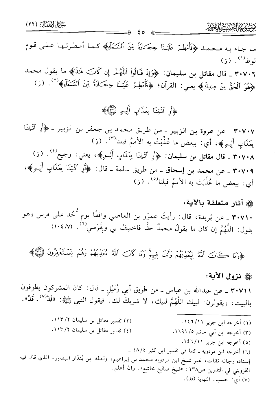 ٣٠٧٠٧ - عن عروة بن الزبير -من طريق محمد بن جعفر بن الزبير- {أو ائتنا بعذاب أليم}، أي: ببعض ما عُذِّبَتْ به الأممُ قبلنا (¬٣). (ز)