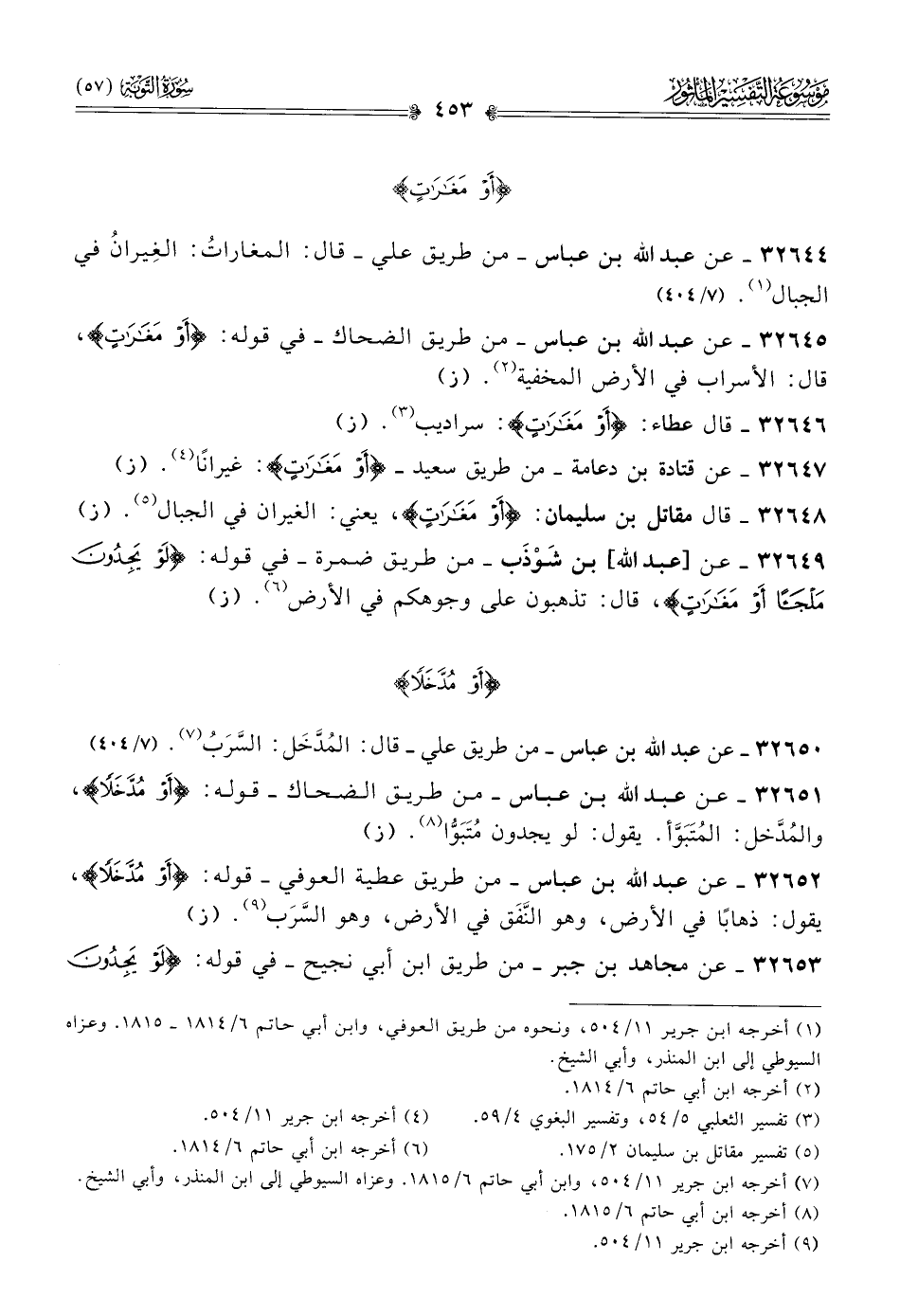 ٣٢٦٤٥ - عن عبد الله بن عباس -من طريق الضحاك- في قوله: {أو مغارات}، قال: الأسراب في الأرض المخفية (¬٢). (ز)